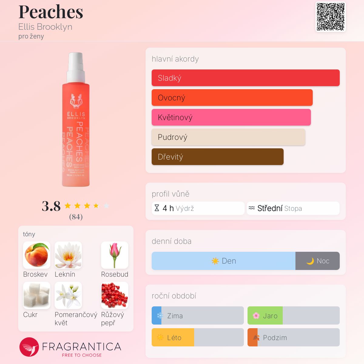 Peaches podle Ellis Brooklyn je Floral Fruity vůně pro ženy. Toto je nová vůně. Peaches byl/a uveden/a v roce 2024. Vrchní tóny jsou Broskev, Leknín a Růžový pepř; střední tóny jsouRůžové poupě, Pomerančový květ, Orris a Vavříny ; základní tóny jsou Cukr, Santalové dřevo, Pižmo, Ambrette (přírodní pižmo) a Virginský cedr.