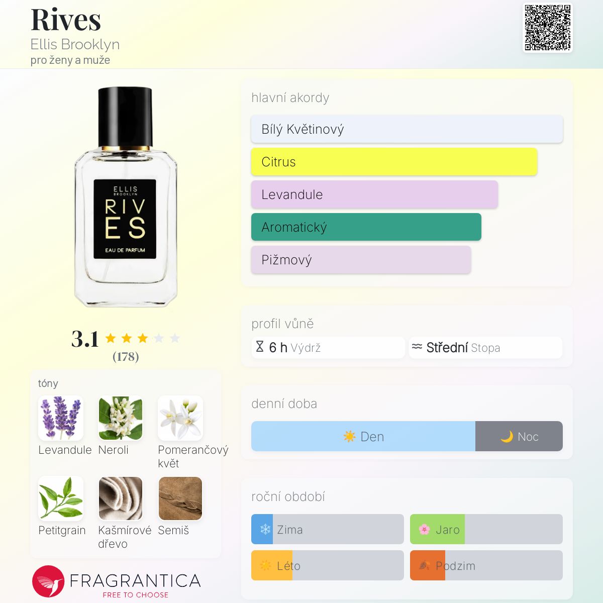 Rives podle Ellis Brooklyn je Citrus Aromatic vůně pro ženy a muže. Rives byl/a uveden/a v roce 2017. "Nosem" za touto vůní je Jérôme Epinette. Vrchní tóny jsou Neroli a Petitgrain; střední tóny jsouLevandule a Pomerančový květ ; základní tóny jsou Kašmírové dřevo a Bílý semiš.