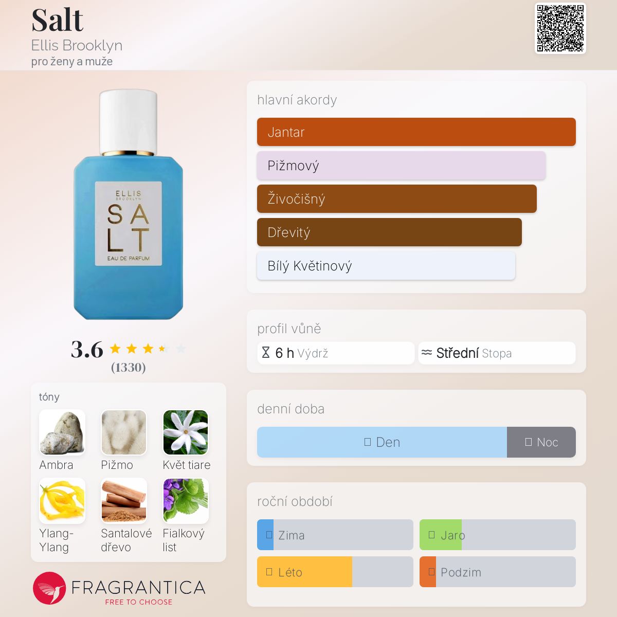 Musím souhlasit se sushideception, Salt je geniální. Vyzkoušela jsem mnoho "plážových" vůní a už mě unavují sladké, vodní, opalovací, kokosové vůně. Už se to opakuje pořád dokola, ale čím víc jsem o SALT četla, tím víc mě zaujala. Koupila jsem si vzorek a shodou okolností mi přišel těsně před mou tříkilometrovou procházkou/během. Nastříkala jsem se a vyšla ven v 97stupňovém vedru na začátek procházky. Nejdřív jsem cítila krémové tóny ylang-ylang a pak se okamžitě začala rozvíjet do sexy, živočišné, dřevité vůně, ze které jsem omdlela. Není to typická denní plážová vůně, je to procházka za svitu měsíce, zatímco vánek od oceánu zvedá vůni naplaveného dřeva, soli a písku. Je to SEXY, lehká, taková "moje kůže, ale lepší" vůně. Vydrží na mně 8-10 hodin a vůbec není vtíravá. Můj manžel ji MILUJE a mně se líbí, že neobsahuje všechny nebezpečné chemikálie. Je opravdu dechberoucí a já se při jejím nošení cítím krásná a sexy. Kudos Ellis Brooklyn!!