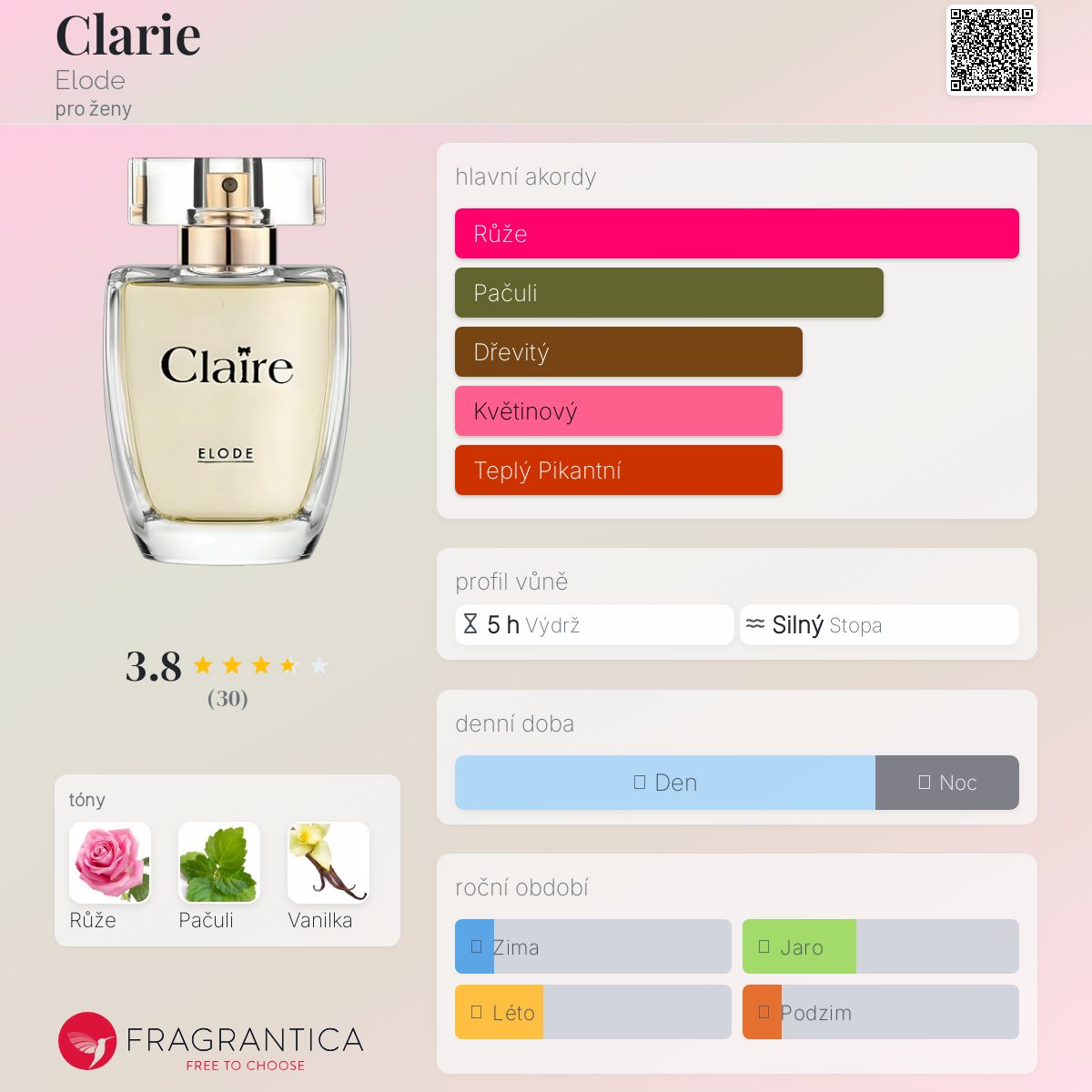 Clarie podle Elode je Orientální Floral vůně pro ženy. Clarie byl/a uveden/a v roce 2019. Vrchní tón je Růže ; střední tóny jsouRůže a Pačuli ; základní tón je Vanilka.