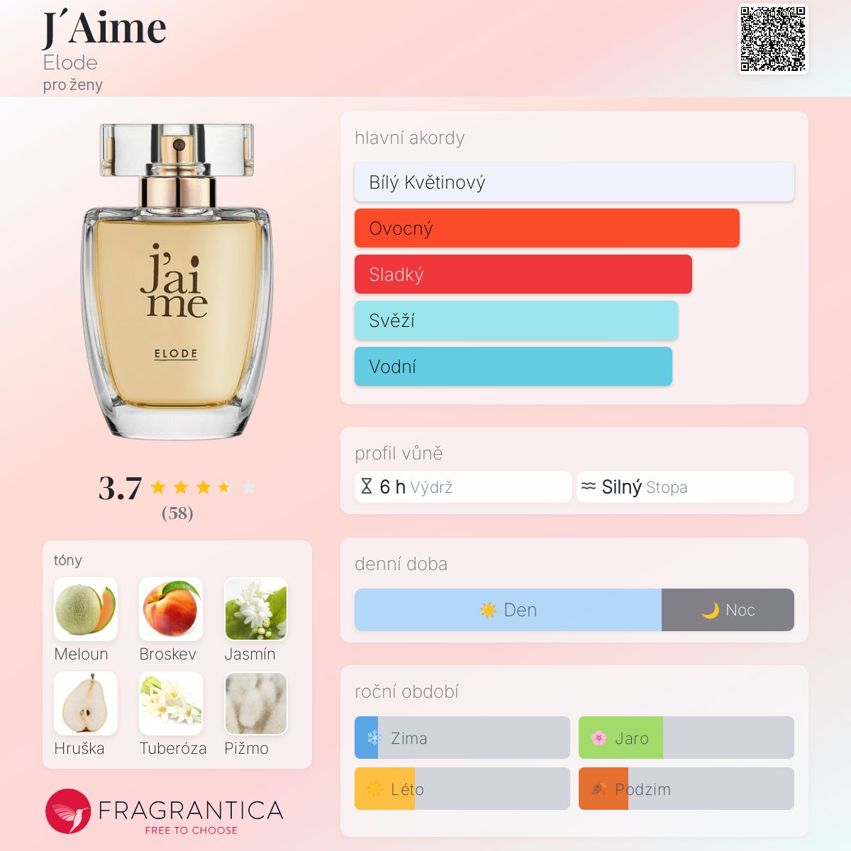 J´Aime podle Elode je Floral Fruity vůně pro ženy. J´Aime byl/a uveden/a v roce 2019. Vrchní tóny jsou Meloun, Broskev, Hruška, Pomeranč, Magnólie a Bergamot; střední tóny jsouJasmín, Tuberóza, Konvalinka, Růže, Fialka, Orchidej, Frézie a Švestka ; základní tóny jsou Pižmo, Vanilka, Cedr a Ostružina.
