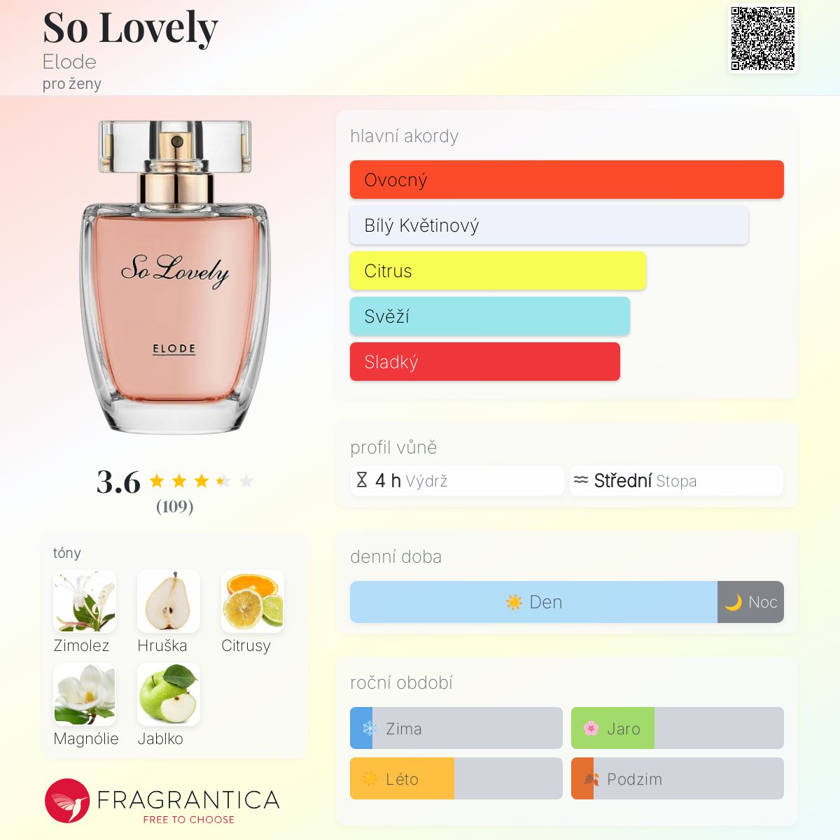 So Lovely podle Elode je Floral Fruity vůně pro ženy. Vrchní tóny jsou Hruška a Citrusy; střední tóny jsouZimolez a Magnólie ; základní tón je Jablko.