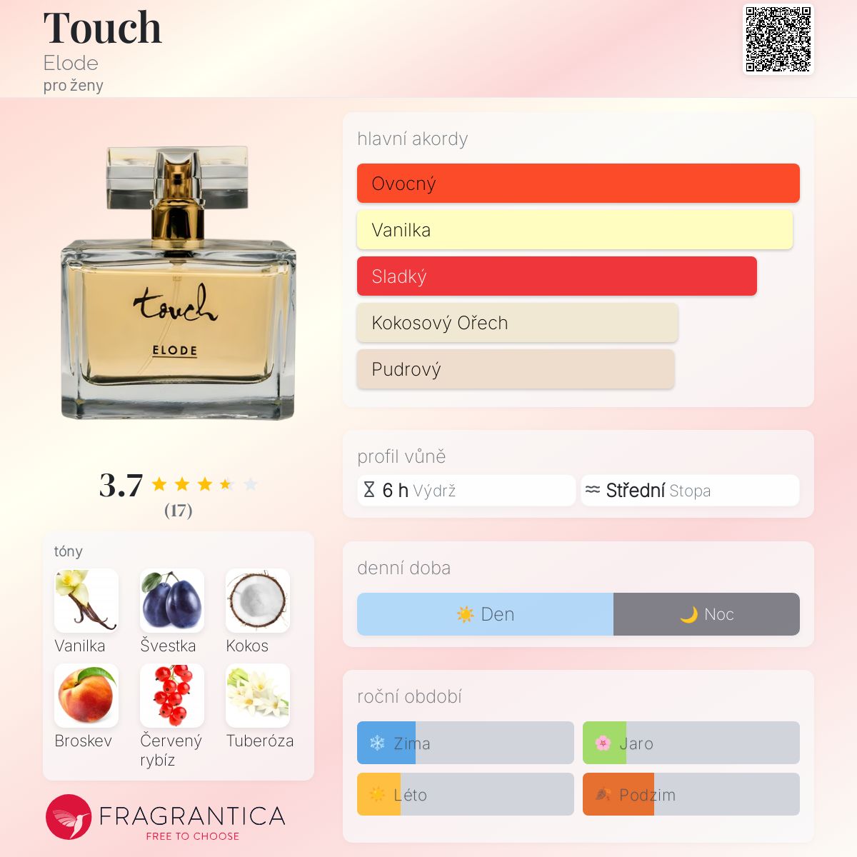Touch podle Elode je Floral Fruity vůně pro ženy. Vrchní tóny jsou Švestka, Broskev a Červený rybíz; střední tóny jsouKokos, Tuberóza, Ibišek a Fialka ; základní tóny jsou Vanilka, Jantar (ambra) a Pačuli.