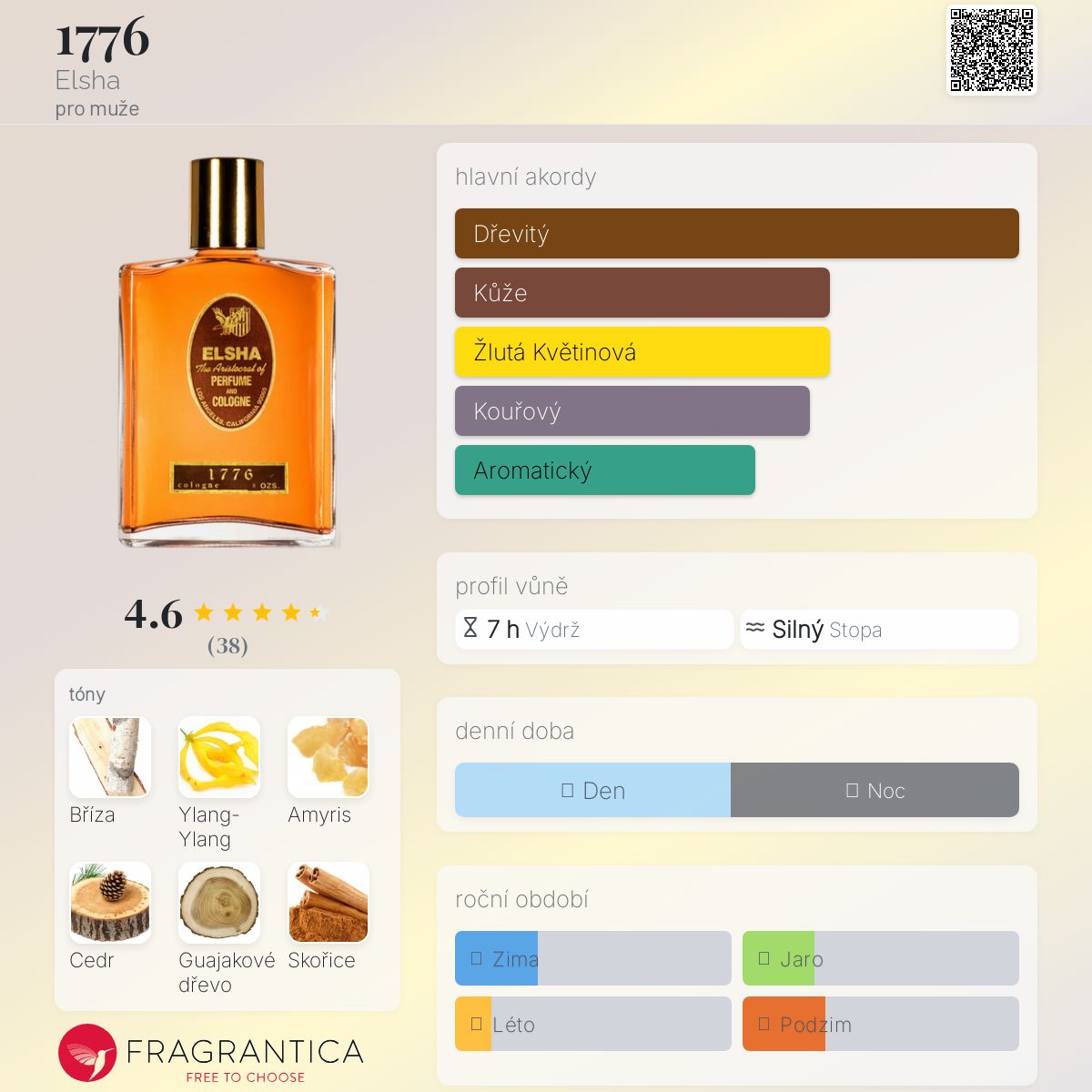 1776 podle Elsha je Orientální Spicy vůně pro muže. Vrchní tóny jsou Bříza a Skořice; střední tóny jsouYlang-Ylang a Levandule ; základní tóny jsou Amyris, Cedr, Guajakové dřevo a Santalové dřevo.