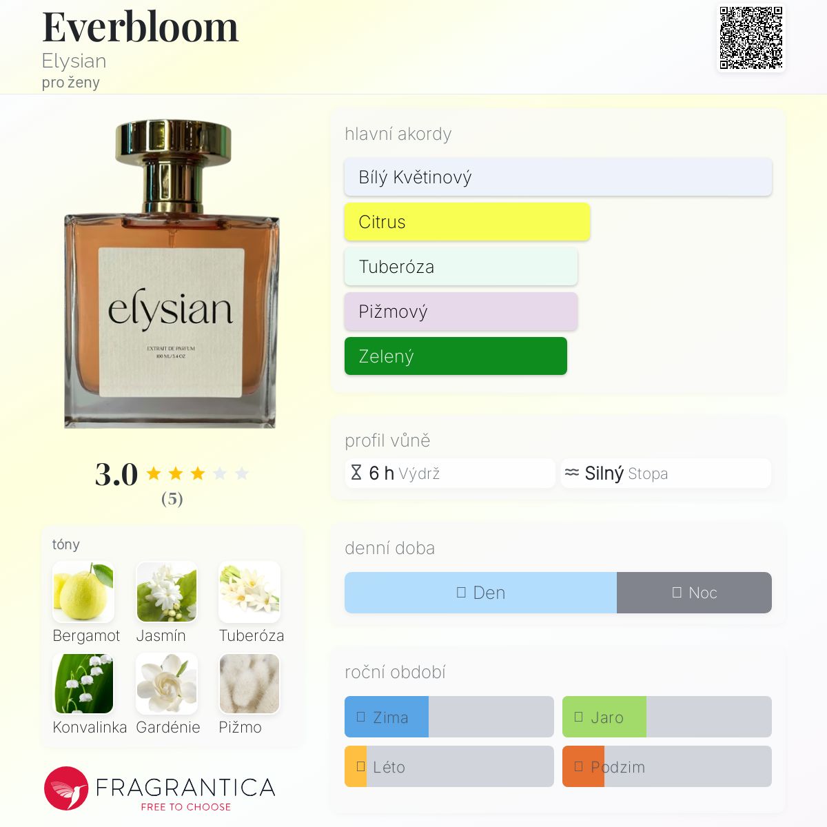 Everbloom podle Elysian je Floral Fruity vůně pro ženy. Toto je nová vůně. Everbloom byl/a uveden/a v roce 2024. "Nosem" za touto vůní je Jessi Park. Vrchní tóny jsou Bergamot, Jasmín, Tuberóza, Konvalinka a Hruška; střední tóny jsouGardénie, Pomerančový květ a Mořské tóny ; základní tóny jsou Bílé pižmo, Kokos a Santalové dřevo.