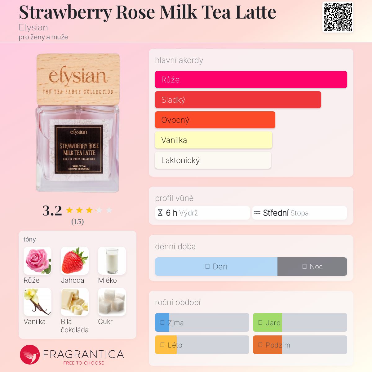 Strawberry Rose Milk Tea Latte podle Elysian je Orientální Vanilla vůně pro ženy a muže. Toto je nová vůně. Strawberry Rose Milk Tea Latte byl/a uveden/a v roce 2025. "Nosem" za touto vůní je Jessi Park.