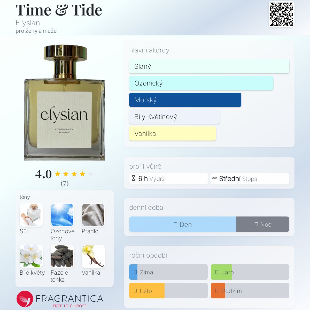 Time & Tide podle Elysian je vůně pro ženy a muže. Toto je nová vůně. Time & Tide byl/a uveden/a v roce 2024. "Nosem" za touto vůní je Jessi Park. Vrchní tóny jsou Mořská sůl, Ozonové tóny a Prádlo; střední tón jeBílé květy ; základní tóny jsou Fazole tonka, Vanilka a Santalové dřevo.