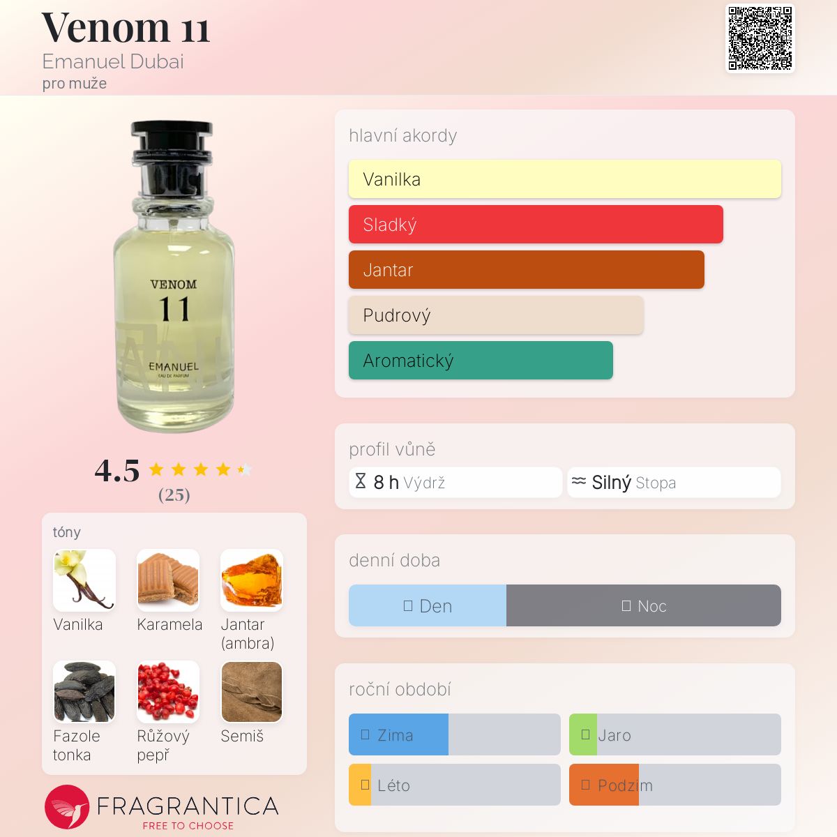 Venom 11 podle Emanuel Dubai je vůně pro muže. Venom 11 byl/a uveden/a v roce 2023. Vrchní tóny jsou Růžový pepř, Jalovec a Fialka; střední tóny jsouKaramela, Skořice, Levandule a Šalvěj ; základní tóny jsou Vanilka, Jantar (ambra), Fazole tonka a Semiš.