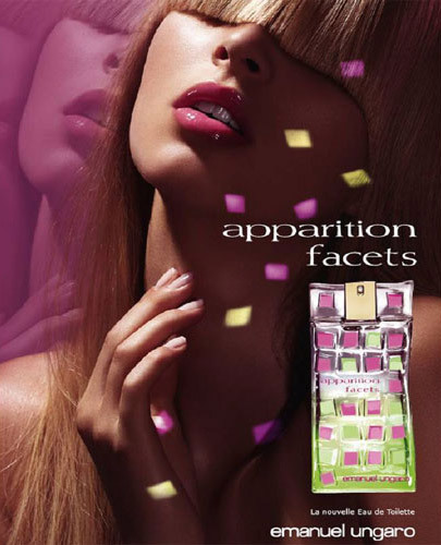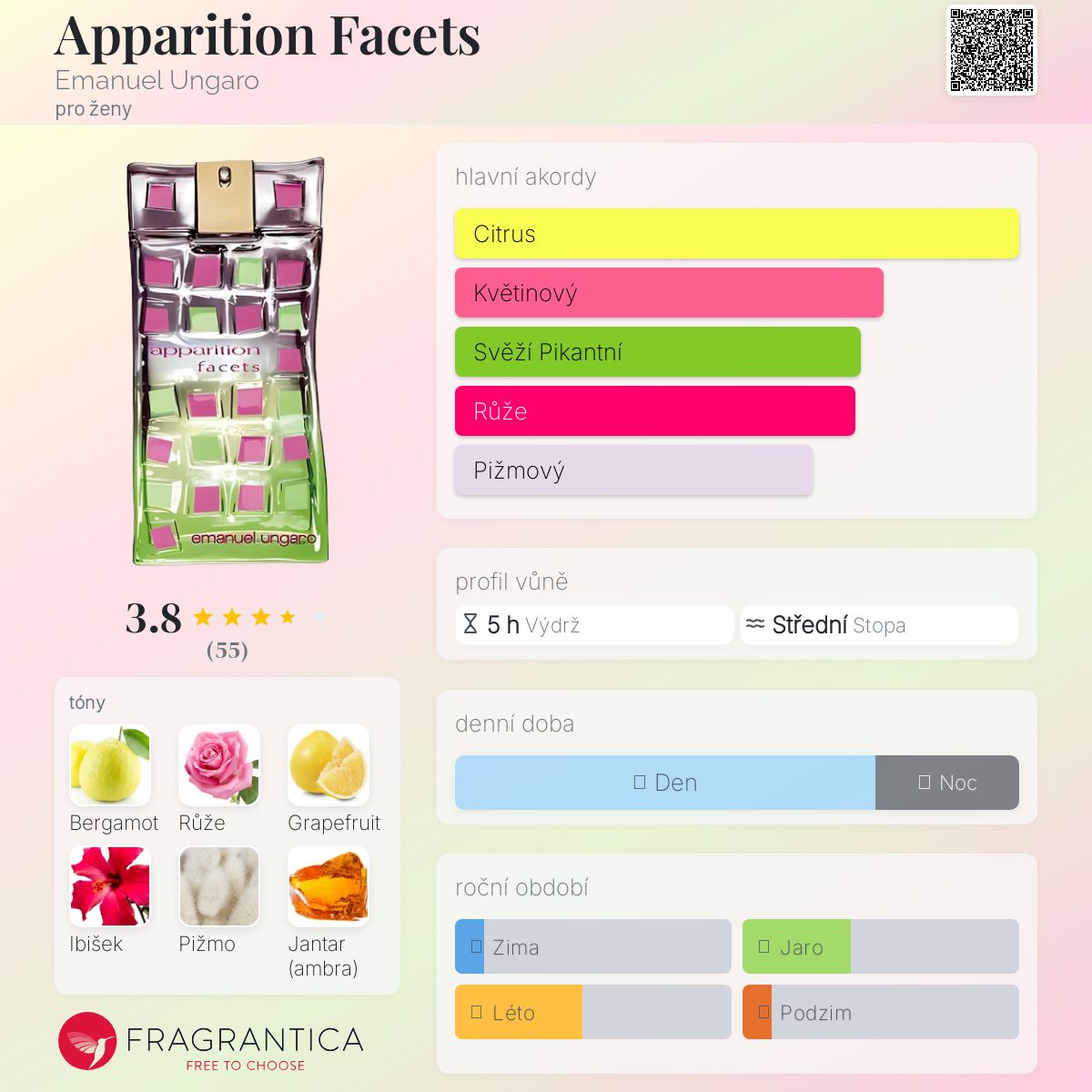 Apparition Facets podle Emanuel Ungaro je Floral Fruity vůně pro ženy. Apparition Facets byl/a uveden/a v roce 2006. "Nosem" za touto vůní je Francoise Caron. Vrchní tóny jsou Bergamot a Grapefruit; střední tóny jsouRůže a Ibišek ; základní tóny jsou Pižmo a Jantar (ambra).