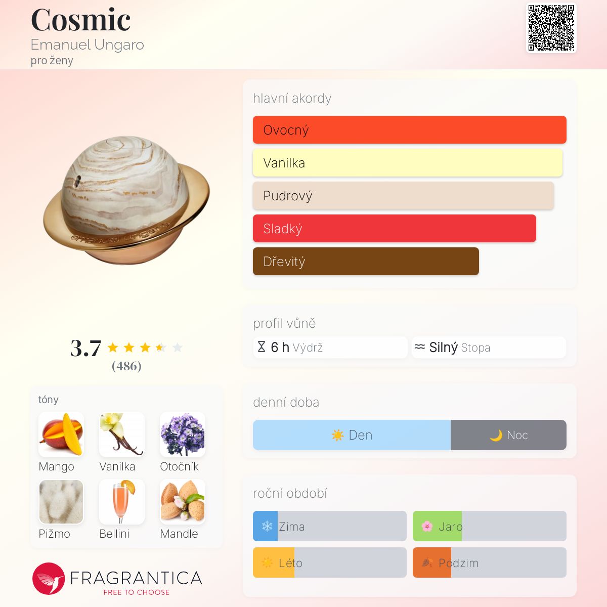 Cosmic podle Emanuel Ungaro je Floral Fruity vůně pro ženy. Toto je nová vůně. Cosmic byl/a uveden/a v roce 2024. "Nosem" za touto vůní je Jérôme Epinette. Vrchní tóny jsou Mango, Mandle, Černý rybíz, Pomeranč, Růžový pepř a Citrón; střední tóny jsouOtočník, Bellini, Pomerančový květ, Kosatec, Fialka a Hruškový květ ; základní tóny jsou Vanilka, Pižmo, Santalové dřevo, Fazole tonka a Pačuli.