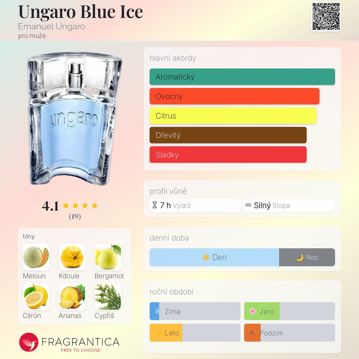 Ungaro Blue Ice podle Emanuel Ungaro je Woody Aromatic vůně pro muže. Ungaro Blue Ice byl/a uveden/a v roce 2012. Vrchní tóny jsou Kalábrijský bergamot, Sicilský citron, Ananas a Guatemalský kardamom; střední tóny jsouMeloun, Kdoule, Cypřiš, Pelyněk a Fialkový list ; základní tóny jsou Šalvěj, Fazole tonka, Santalové dřevo, Singapurské pačuli, Cedr a Jantar (ambra).