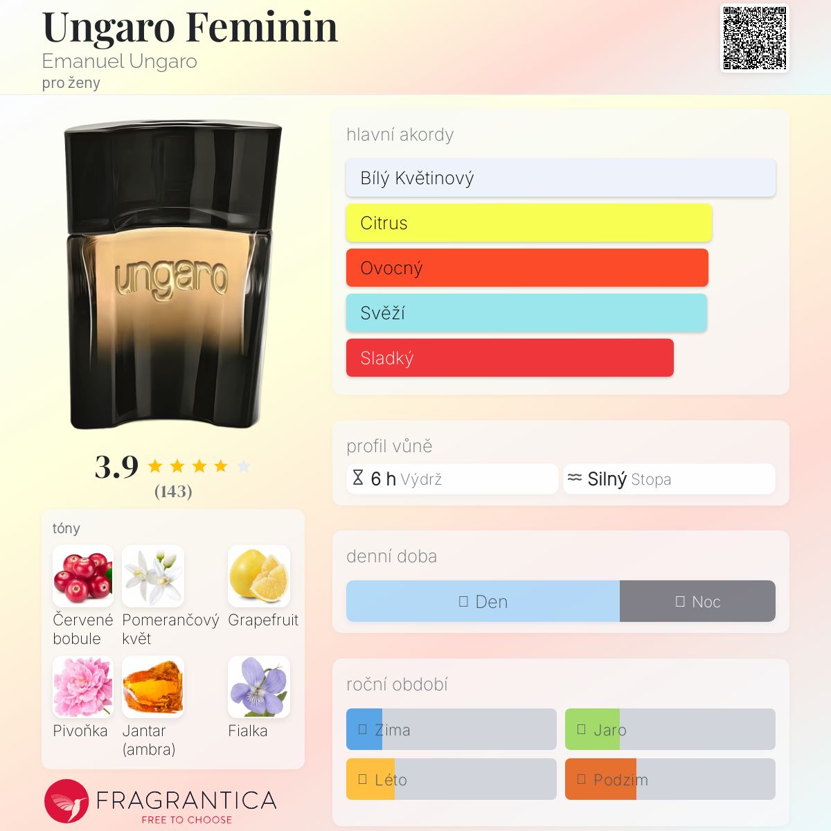 Ungaro Feminin podle Emanuel Ungaro je Floral Woody Musk vůně pro ženy. Ungaro Feminin byl/a uveden/a v roce 2014. Vrchní tóny jsou Červené bobule, Grapefruit a Pivoňka; střední tóny jsouPomerančový květ, Fialka a Jasmín ; základní tóny jsou Jantar (ambra), Pižmo a Bílé dřevo.