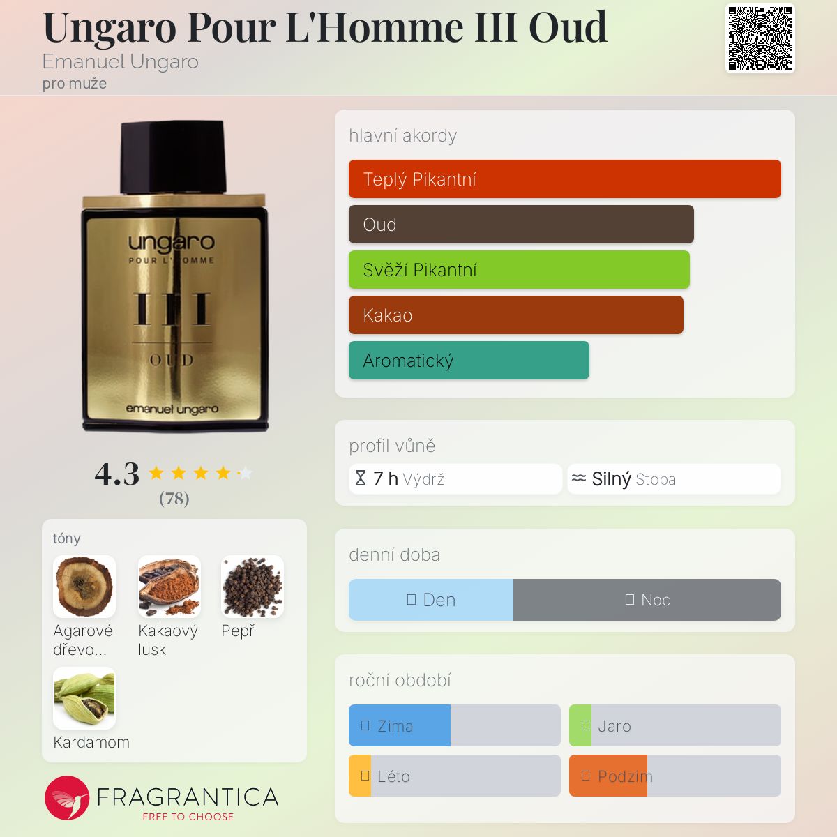 Ungaro Pour L'Homme III Oud podle Emanuel Ungaro je Woody Spicy vůně pro muže. Ungaro Pour L'Homme III Oud byl/a uveden/a v roce 2015. "Nosem" za touto vůní je Julie Massé. Vrchní tóny jsou Pepř a Kardamom; střední tón jeKakaový lusk ; základní tón je Agarové dřevo (oud).