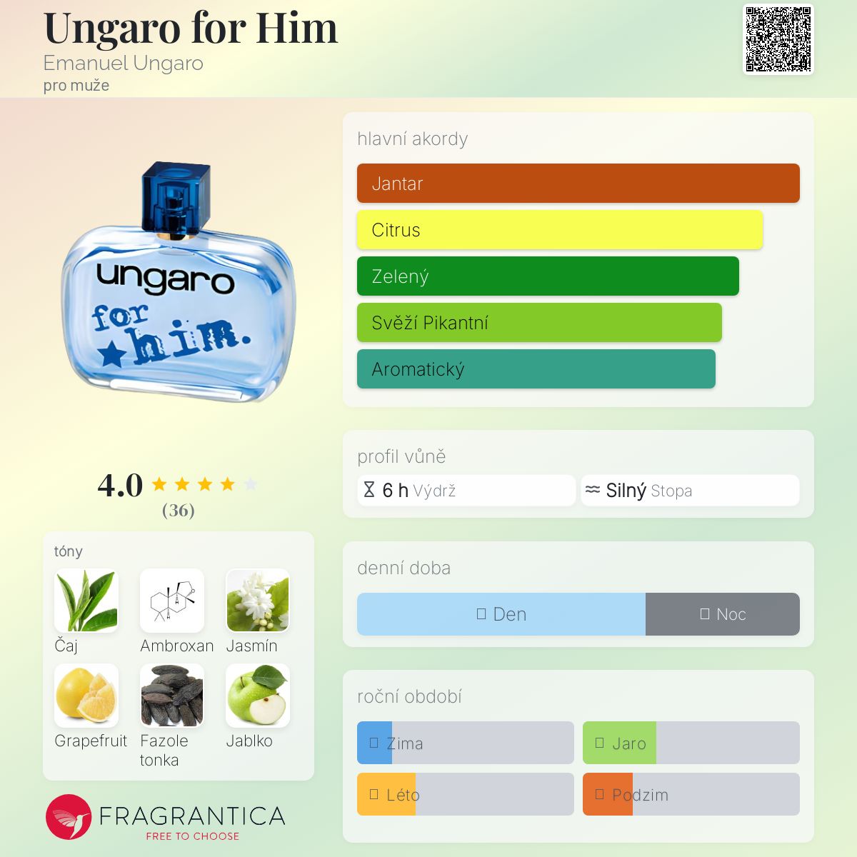 Ungaro for Him podle Emanuel Ungaro je Woody Aromatic vůně pro muže. Ungaro for Him byl/a uveden/a v roce 2013. Vrchní tóny jsou Čaj, Grapefruit, Jablko, Sečuánský pepř a Pomeranč; střední tóny jsouJasmín, Myrha, Koriandr a Máta ; základní tóny jsou Ambroxan, Fazole tonka, Dřevité tóny a Tabák.