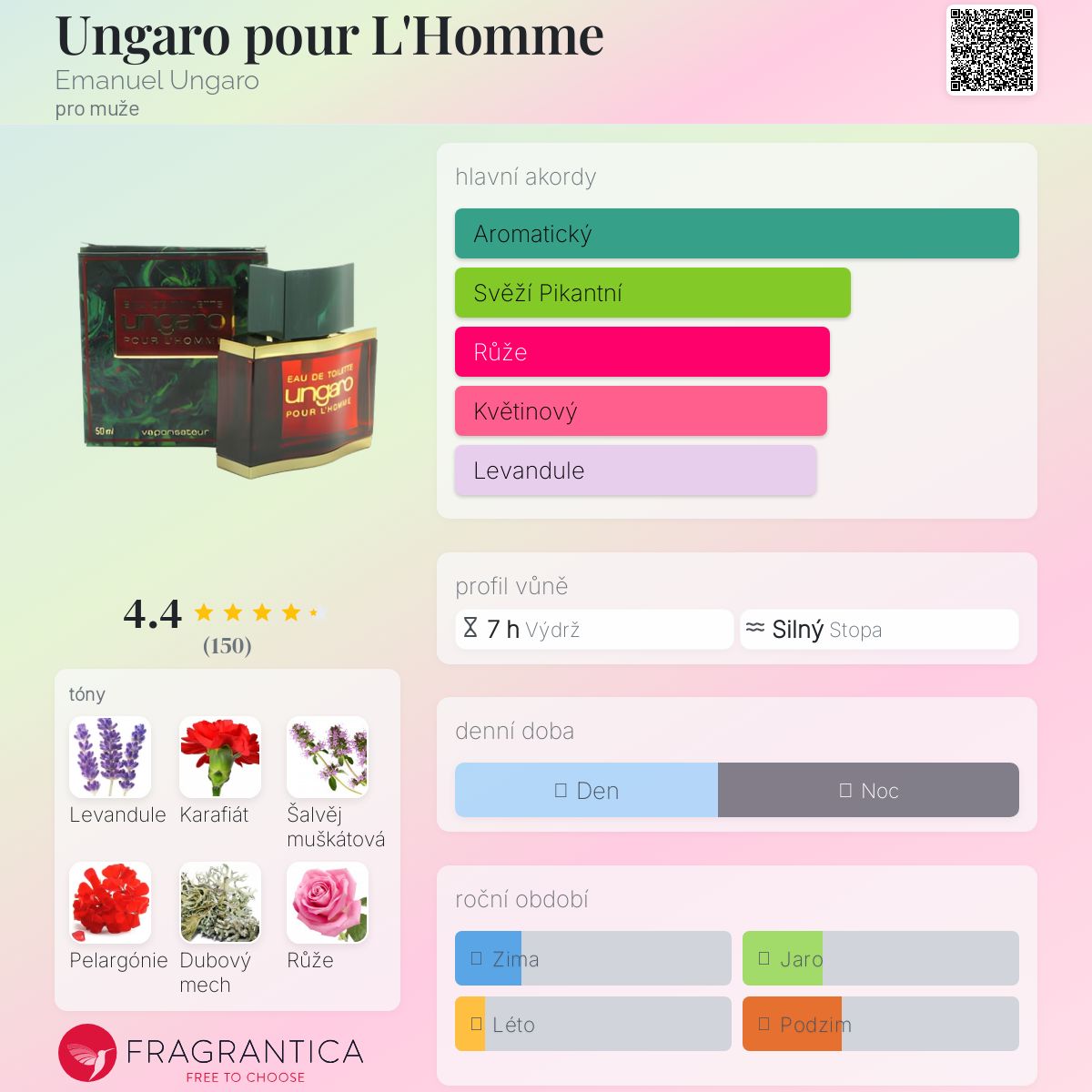 Ungaro pour L'Homme podle Emanuel Ungaro je Orientální Fougere vůně pro muže. Ungaro pour L'Homme byl/a uveden/a v roce 1991. "Nosem" za touto vůní je François Demachy. Vrchní tóny jsou Levandule, Petitgrain, Citrón, Bergamot a Jehličí borovice; střední tóny jsouKarafiát, Šalvěj muškátová, Pelargónie, Růže, Jasmín a Pelyněk ; základní tóny jsou Dubový mech, Jantar (ambra), Pižmo, Fazole tonka, Santalové dřevo a Med.