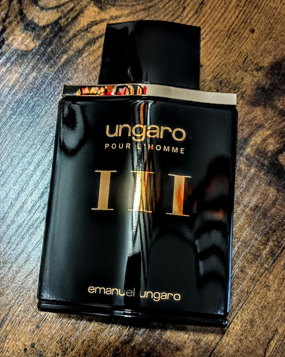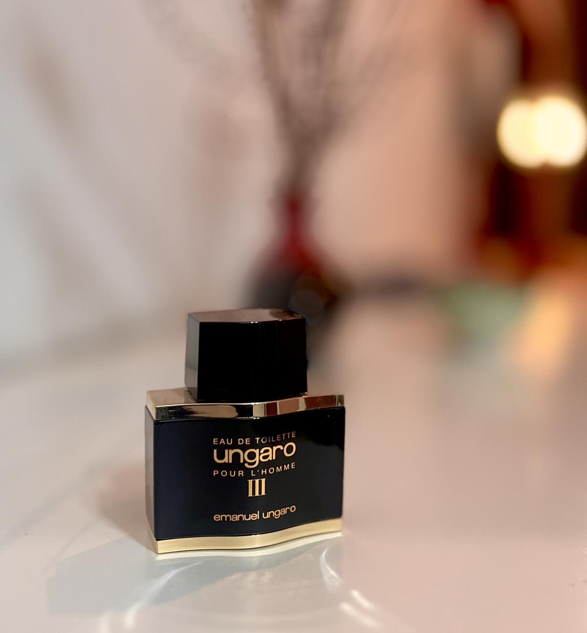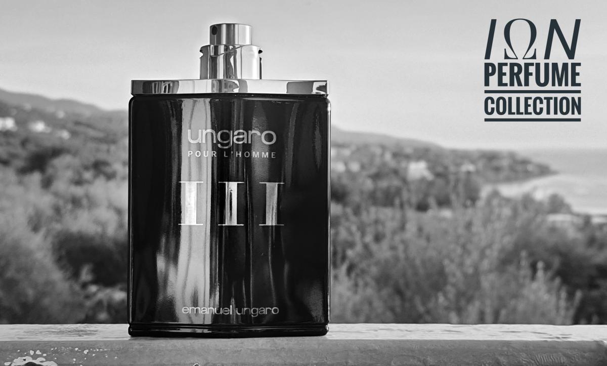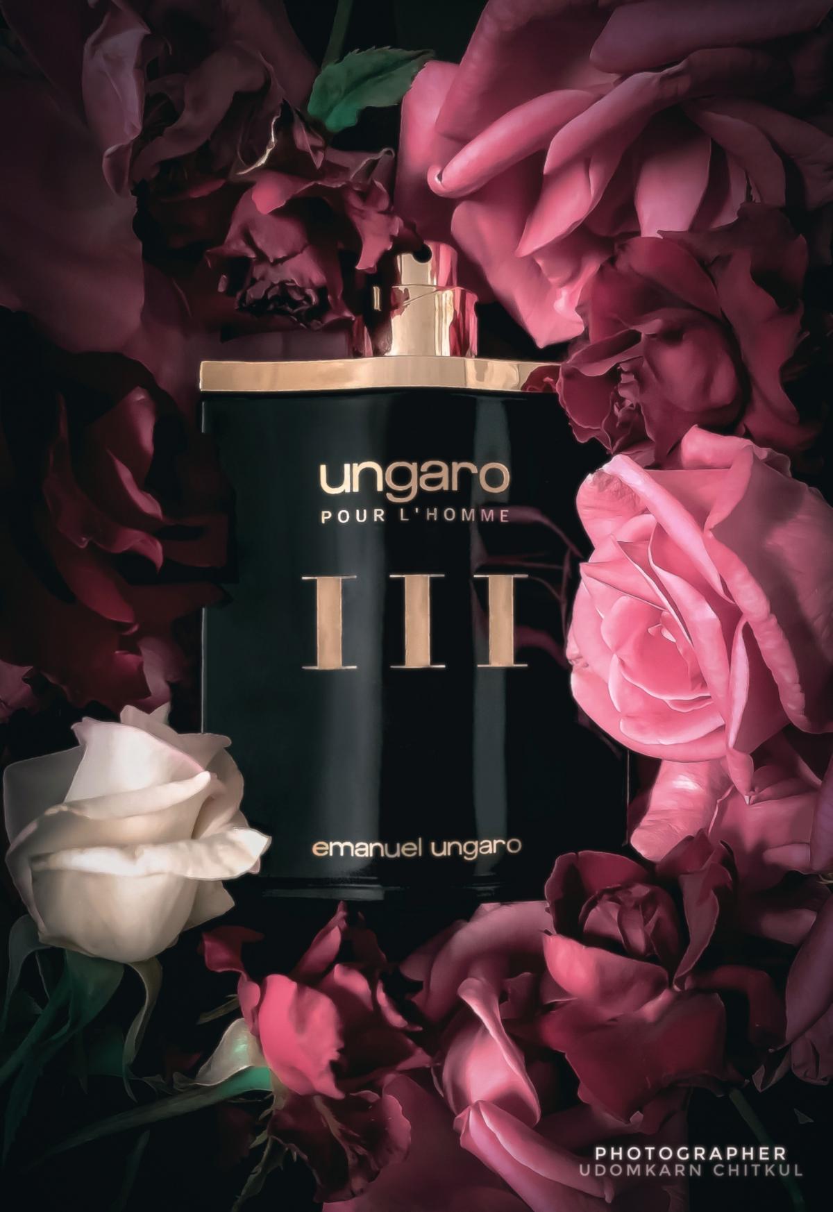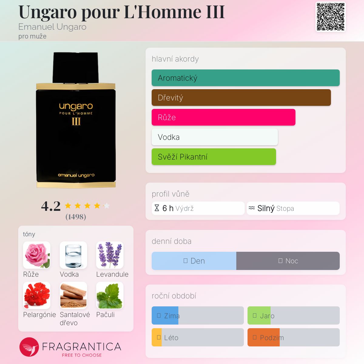 Ungaro pour L'Homme III podle Emanuel Ungaro je Aromatic Green vůně pro muže. Ungaro pour L'Homme III byl/a uveden/a v roce 1993. Vrchní tóny jsou Vodka, Levandule, Koriandr, Šalvěj, Pomeranč, Mahagon a Citrón; střední tóny jsouRůže, Pelargónie, Jasmín a Konvalinka ; základní tóny jsou Santalové dřevo, Pačuli, Vetiver, Dubový mech, Cedr a Pižmo.