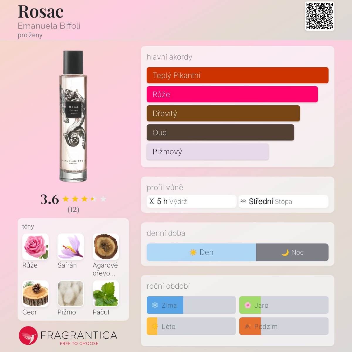 Rosae podle Emanuela Biffoli je Floral vůně pro ženy. Rosae byl/a uveden/a v roce 2021. Vrchní tóny jsou Damašská růže, Růžový pepř, Muškátový oříšek a Hřebíček; střední tóny jsouŠafrán, Myrha, Opoponax, Jasmín a Pelargónie ; základní tóny jsou Agarové dřevo (oud), Cedr, Pižmo, Pačuli a Santalové dřevo.