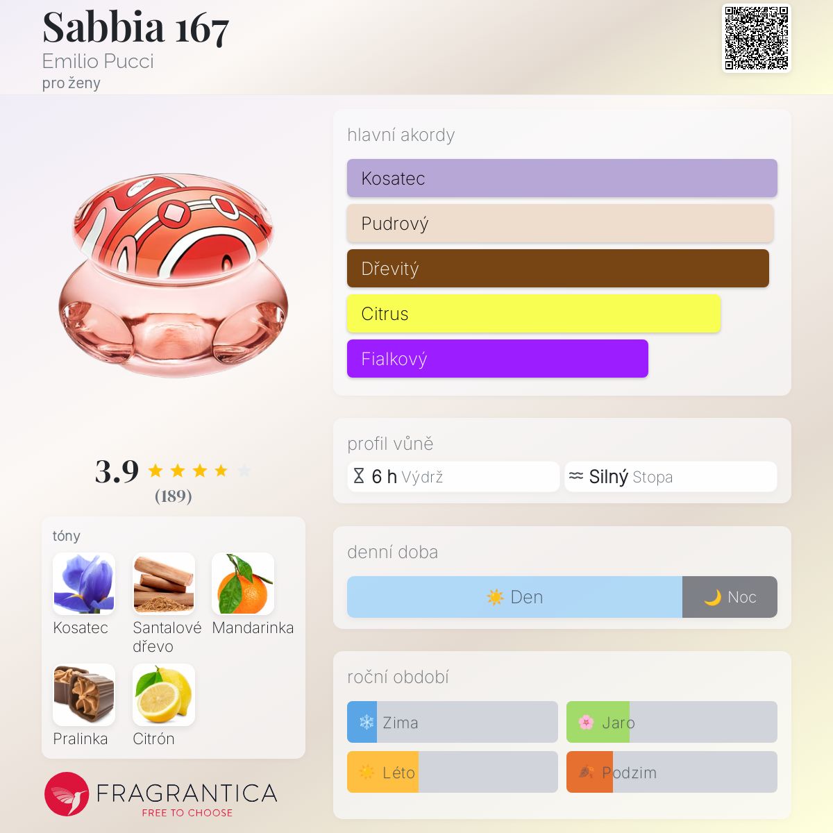Sabbia 167 podle Emilio Pucci je Citrus vůně pro ženy. Sabbia 167 byl/a uveden/a v roce 2009. "Nosem" za touto vůní je Annick Menardo. Vrchní tóny jsou Mandarinka a Citron amalfi; střední tóny jsouKosatec a Pralinka ; základní tón je Santalové dřevo.