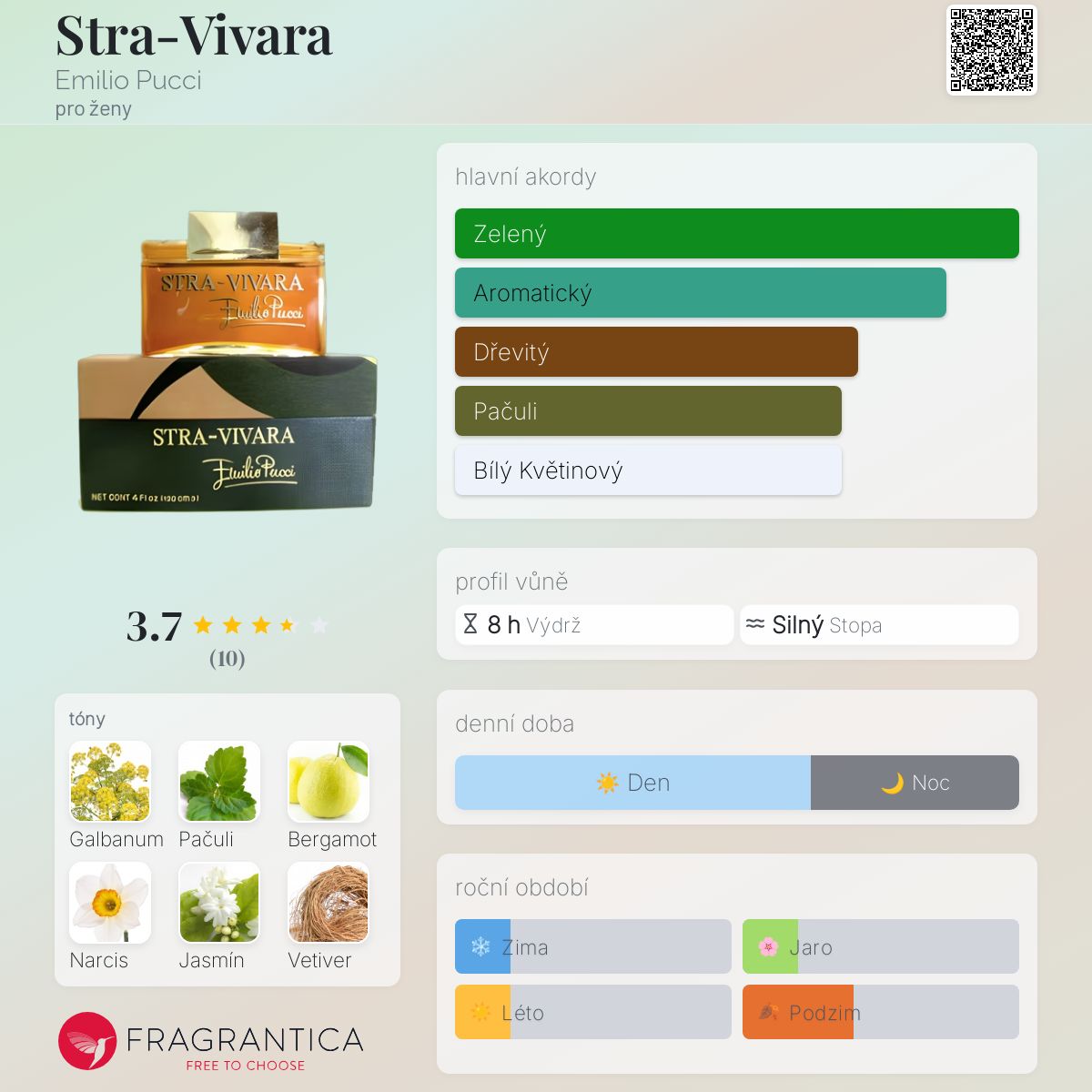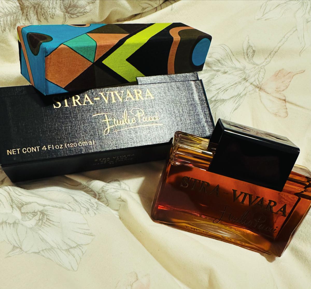 Stra-Vivara podle Emilio Pucci je Chypre Floral vůně pro ženy. Stra-Vivara byl/a uveden/a v roce 1970. Vrchní tóny jsou Galbanum, Bergamot a Amaretto; střední tóny jsouNarcis, Jasmín a Pomerančový květ ; základní tóny jsou Pačuli, Vetiver a Kosatec.