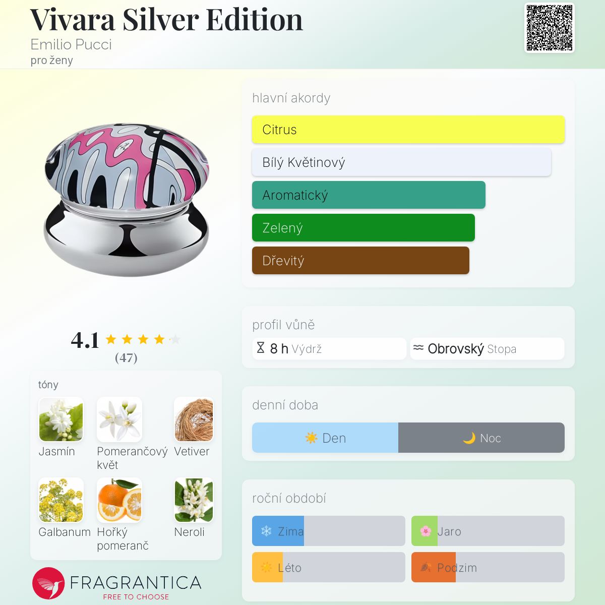 Vivara Silver Edition podle Emilio Pucci je Chypre Floral vůně pro ženy. Vivara Silver Edition byl/a uveden/a v roce 2008. Vivara Silver Edition byl/a vytvořen/a François Demachy, Natalie Gracia-Cetto a Marie-Aude Couture. Vrchní tóny jsou Galbanum, Hořký pomeranč a Bergamot; střední tóny jsouJasmín, Pomerančový květ a Neroli ; základní tóny jsou Vetiver, Kosatec a Pačuli.