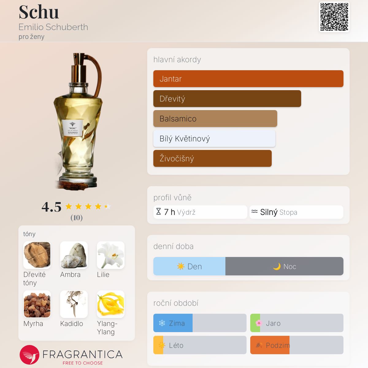 Schu podle Emilio Schuberth je vůně pro ženy. Vrchní tóny jsou Pelyněk, Andělika a Badyán; střední tóny jsouBílá lilie, Myrha, Kadidlo a Ylang-Ylang ; základní tóny jsou Dřevité tóny, Ambra, Vetiver a Agarové dřevo (oud).