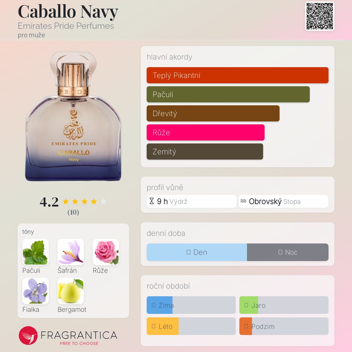 Caballo Navy podle Emirates Pride Perfumes je Aromatic vůně pro muže. Caballo Navy byl/a uveden/a v roce 2019. "Nosem" za touto vůní je Hamid Merati-Kashani. Vrchní tón je Bergamot ; střední tóny jsouRůže a Fialka ; základní tóny jsou Pačuli a Šafrán.
