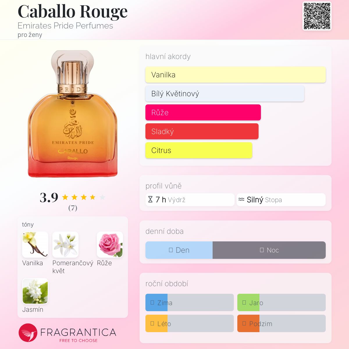 Caballo Rouge podle Emirates Pride Perfumes je Floral vůně pro ženy. Caballo Rouge byl/a uveden/a v roce 2019. "Nosem" za touto vůní je Hamid Merati-Kashani. Vrchní tón je Pomerančový květ ; střední tóny jsouRůže a Jasmín ; základní tón je Vanilka.