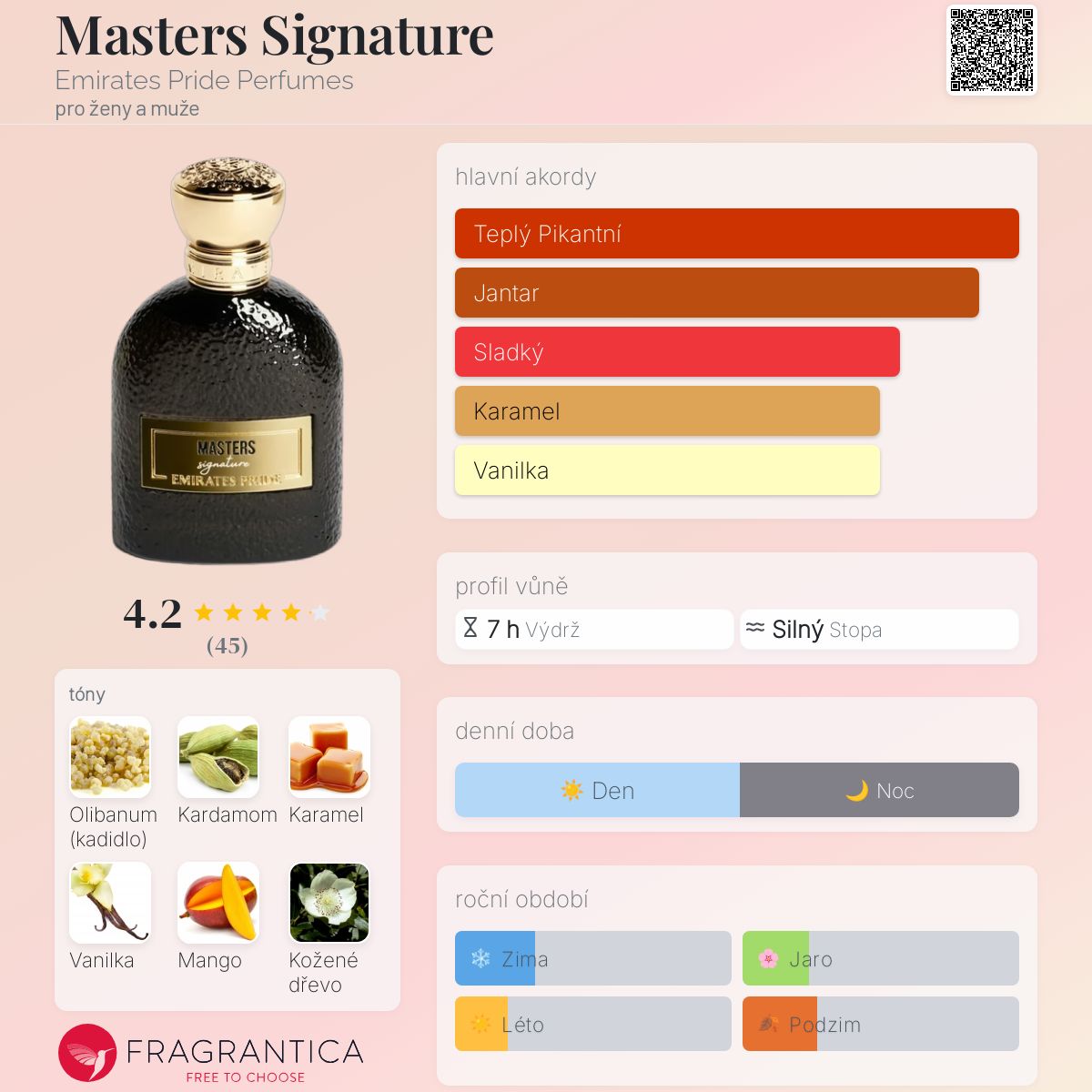 Masters Signature podle Emirates Pride Perfumes je vůně pro ženy a muže. Toto je nová vůně. Masters Signature byl/a uveden/a v roce 2025. Masters Signature byl/a vytvořen/a Alberto Morillas, Olivier Cresp a Nathalie Lorson. Vrchní tóny jsou Kardamom a Mango; střední tóny jsouOlibanum a Karamel ; základní tóny jsou Vanilka, Kožené dřevo a Pižmo.