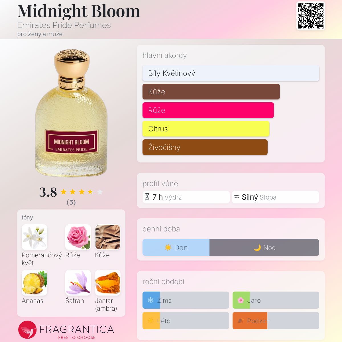 Midnight Bloom podle Emirates Pride Perfumes je Orientální Floral vůně pro ženy a muže. Toto je nová vůně. Midnight Bloom byl/a uveden/a v roce 2025. "Nosem" za touto vůní je Gaël Montero. Vrchní tóny jsou Ananas a Šafrán; střední tóny jsouPomerančový květ a Růže ; základní tóny jsou Kůže a Jantar (ambra).