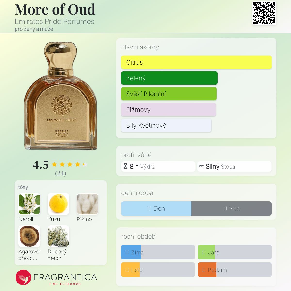 More of Oud podle Emirates Pride Perfumes je Woody Aromatic vůně pro ženy a muže. Toto je nová vůně. More of Oud byl/a uveden/a v roce 2023. Vrchní tóny jsou Neroli a Yuzu; střední tón jeDubový mech ; základní tóny jsou Bílé pižmo a Agarové dřevo (oud).