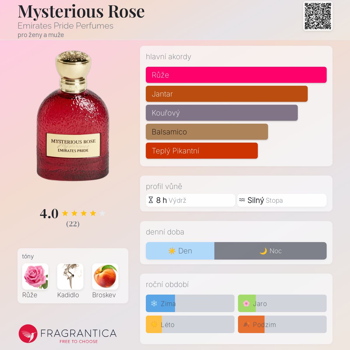 Mysterious Rose podle Emirates Pride Perfumes je Floral vůně pro ženy a muže. Mysterious Rose byl/a uveden/a v roce 2021. "Nosem" za touto vůní je Hamid Merati-Kashani. Vrchní tón je Broskev ; střední tón jeBulharská růže ; základní tón je Kadidlo.