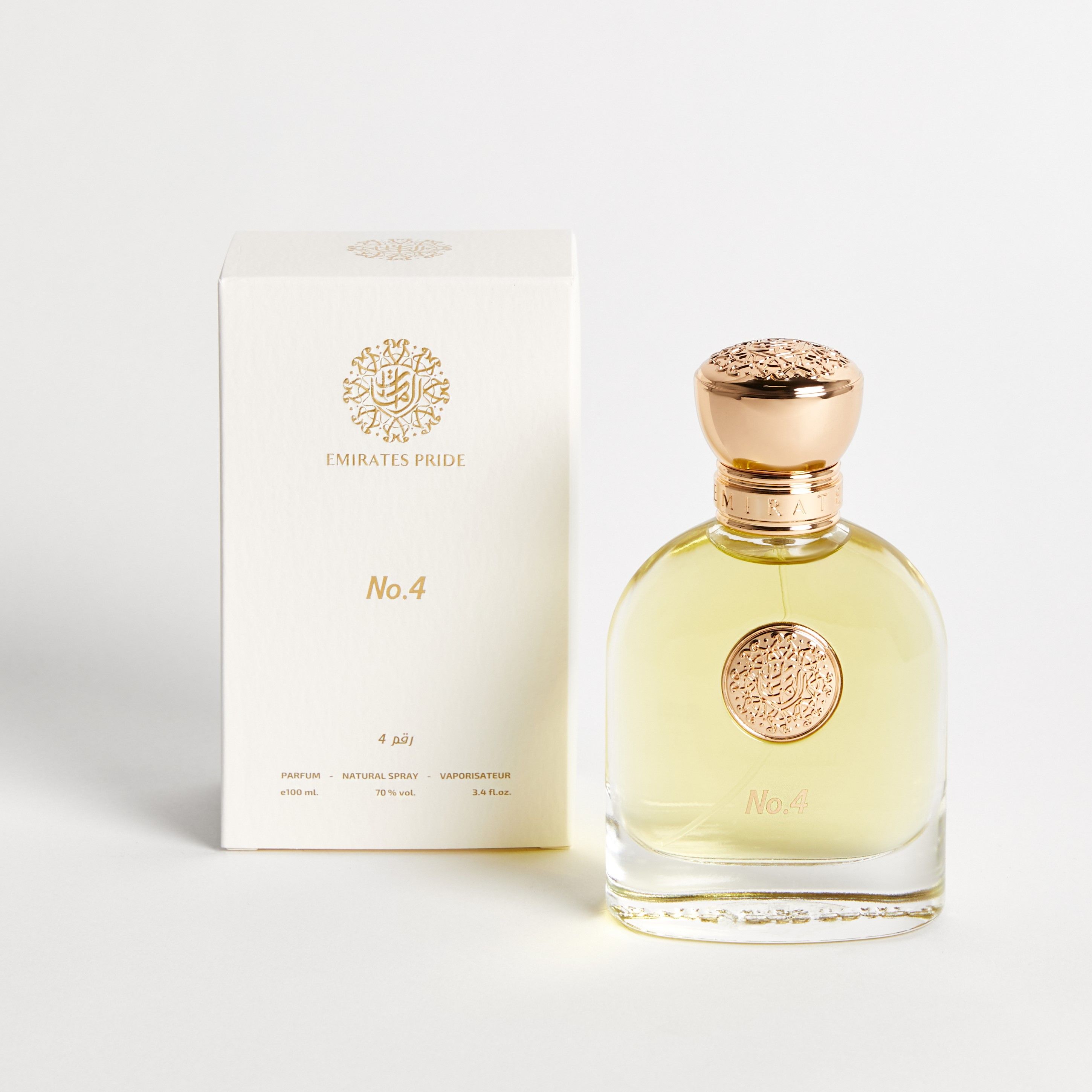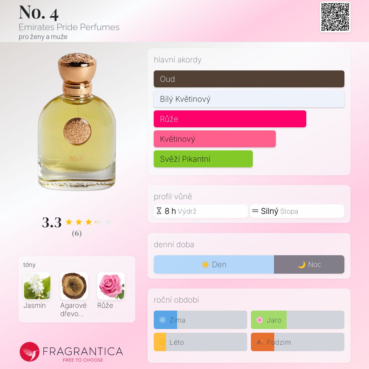 No. 4 podle Emirates Pride Perfumes je Orientální Floral vůně pro ženy a muže. Vrchní tón je Turecká růže ; střední tón jeEgyptský jasmín ; základní tón je Agarové dřevo (oud).