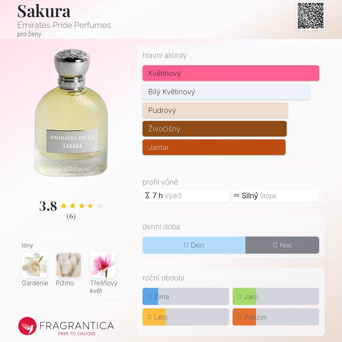 Sakura podle Emirates Pride Perfumes je Floral vůně pro ženy. Sakura byl/a uveden/a v roce 2017. "Nosem" za touto vůní je Nanako Ogi. Vrchní tón je Gardénie ; střední tón jeTřešňový květ ; základní tón je Bílé pižmo.