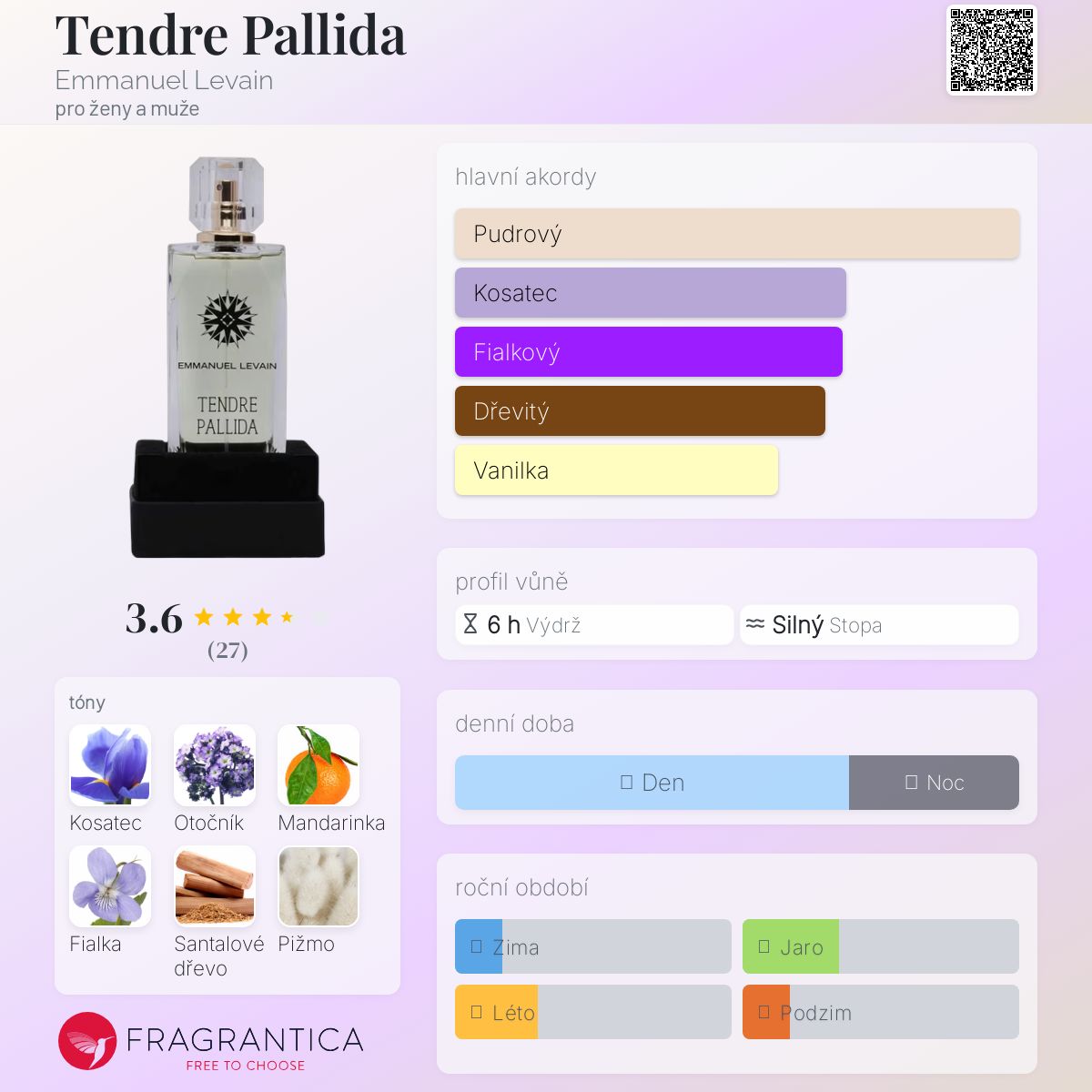 Tendre Pallida podle Emmanuel Levain je Floral Woody Musk vůně pro ženy a muže. "Nosem" za touto vůní je Emmanuel Levain. Vrchní tóny jsou Mandarinka a Okvětní lístky růží; střední tóny jsouKosatec, Otočník, Fialka a Růže ; základní tóny jsou Santalové dřevo, Bílé pižmo, Jantar (ambra) a Cedr.
