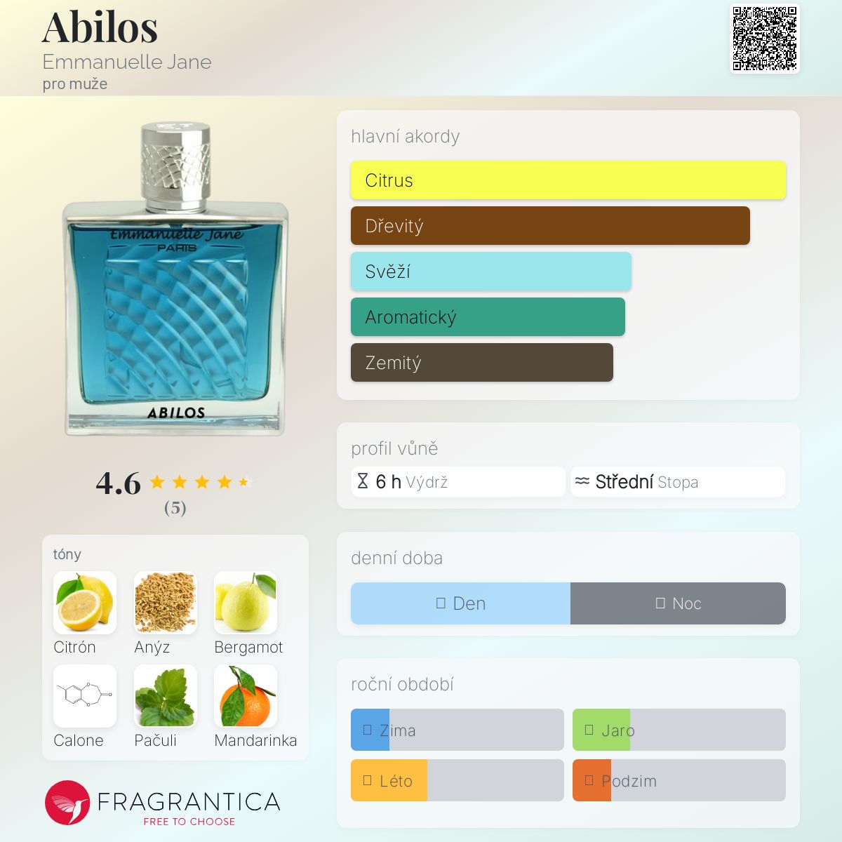 Abilos podle Emmanuelle Jane je Woody Aquatic vůně pro muže. Vrchní tóny jsou Citrón, Anýz, Bergamot a Mandarinka; střední tóny jsouCalone, Levandule a Cedr ; základní tóny jsou Pačuli, Mech, Santalové dřevo a Ambra.