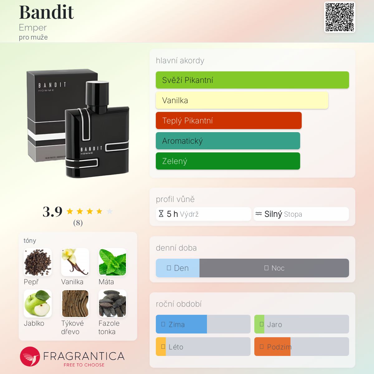 Bandit podle Emper je Woody Spicy vůně pro muže. Vrchní tóny jsou Černý pepř, Bergamot, Kardamom a Zázvor; střední tóny jsouPikantní máta, Granny Smith jablko, Týkové dřevo a Skořice ; základní tóny jsou Vanilka, Fazole tonka a Jantar (ambra).