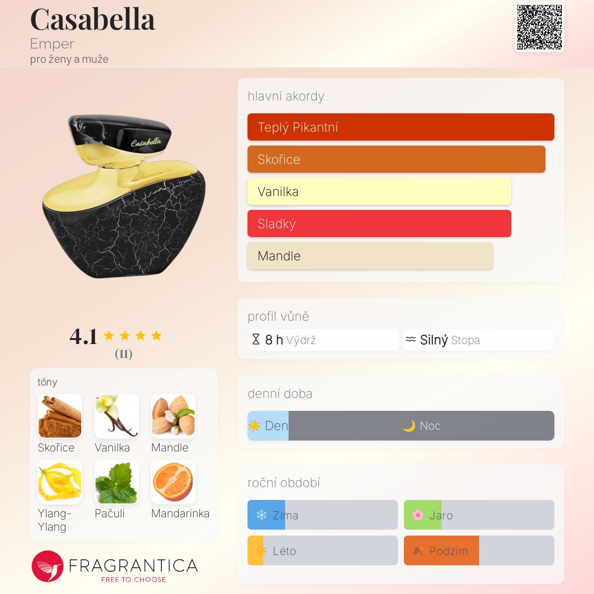 Casabella podle Emper je Floral vůně pro ženy a muže. Casabella byl/a uveden/a v roce 2018. Vrchní tóny jsou Ylang-Ylang, Mandarinka a Pomeranč; střední tóny jsouSkořice, Mandle, Růže a Brambořík ; základní tóny jsou Vanilka, Pačuli a Pižmo.