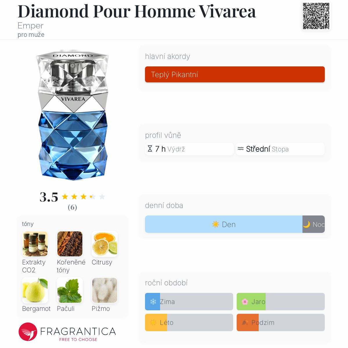 Diamond Pour Homme Vivarea podle Emper je Aromatic vůně pro muže. Diamond Pour Homme Vivarea byl/a uveden/a v roce 2016. Vrchní tóny jsou Citrusy a Bergamot; střední tóny jsouExtrakty CO2, Kořeněné tóny a Pačuli ; základní tóny jsou Pižmo a Jantar (ambra).