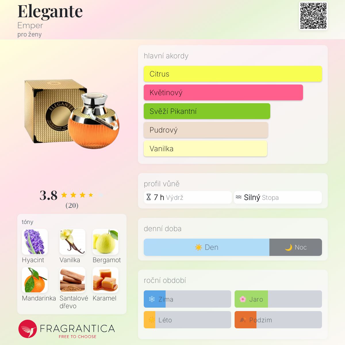 Elegante podle Emper je Orientální Vanilla vůně pro ženy. Vrchní tóny jsou Hyacint, Bergamot a Mandarinka; střední tóny jsouSantalové dřevo, Karamel a Magnólie ; základní tóny jsou Vanilka a Bílé pižmo.