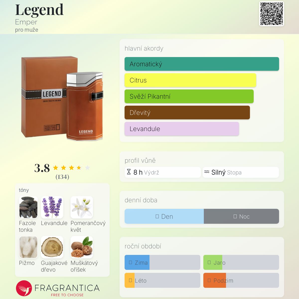 Legend podle Emper je Woody Spicy vůně pro muže. Vrchní tóny jsou Pomerančový květ, Citrón, Grapefruit a Rozmarýn; střední tóny jsouLevandule, Guajakové dřevo, Muškátový oříšek, Koriandr a Týkové dřevo ; základní tóny jsou Fazole tonka, Pižmo a Dubový mech.