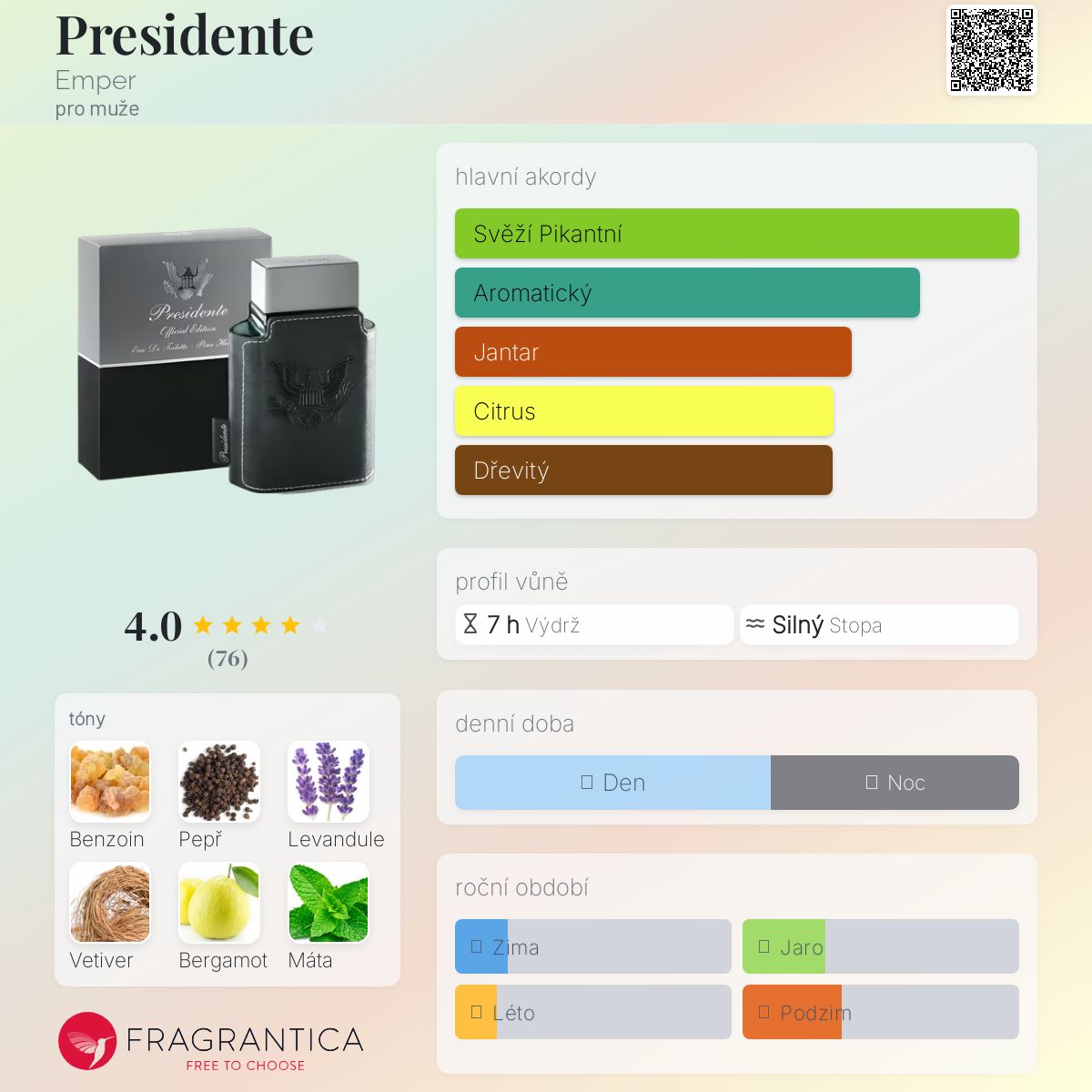 Presidente podle Emper je Orientální Fougere vůně pro muže. Vrchní tóny jsou Černý pepř, Bergamot a Citrón; střední tóny jsouLevandule, Máta a Muškátový oříšek ; základní tóny jsou Benzoin, Vetiver, Pižmo a Cedr.