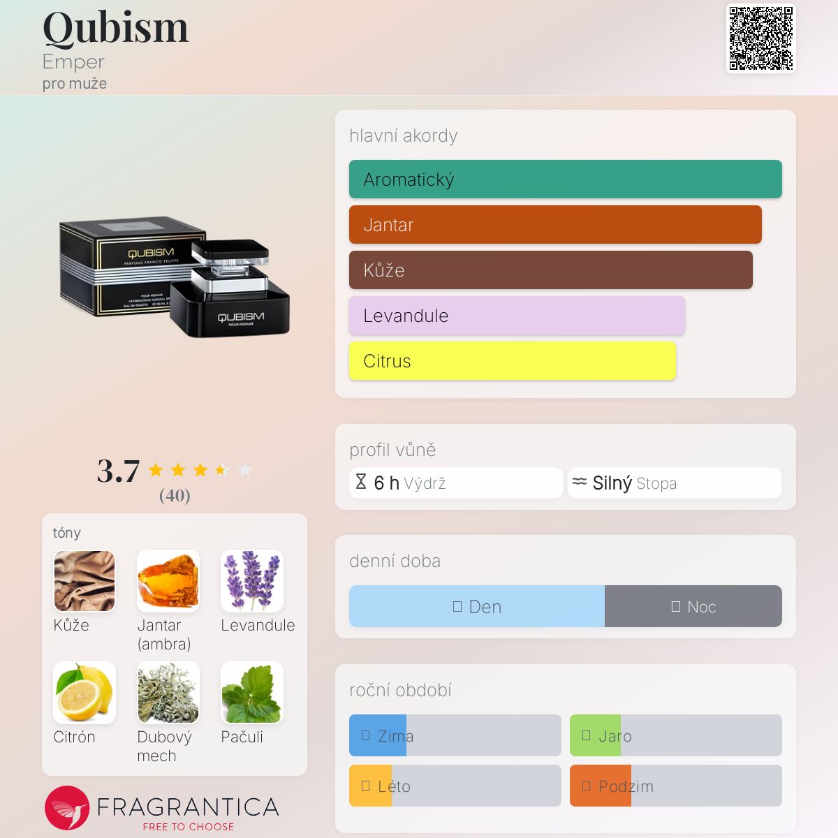 Qubism podle Emper je Orientální Fougere vůně pro muže. Vrchní tóny jsou Italský citrón, Koriandr a Kardamom; střední tóny jsouLevandule, Pačuli a Pelargónie ; základní tóny jsou Kůže, Jantar (ambra), Dubový mech a Labdanum.
