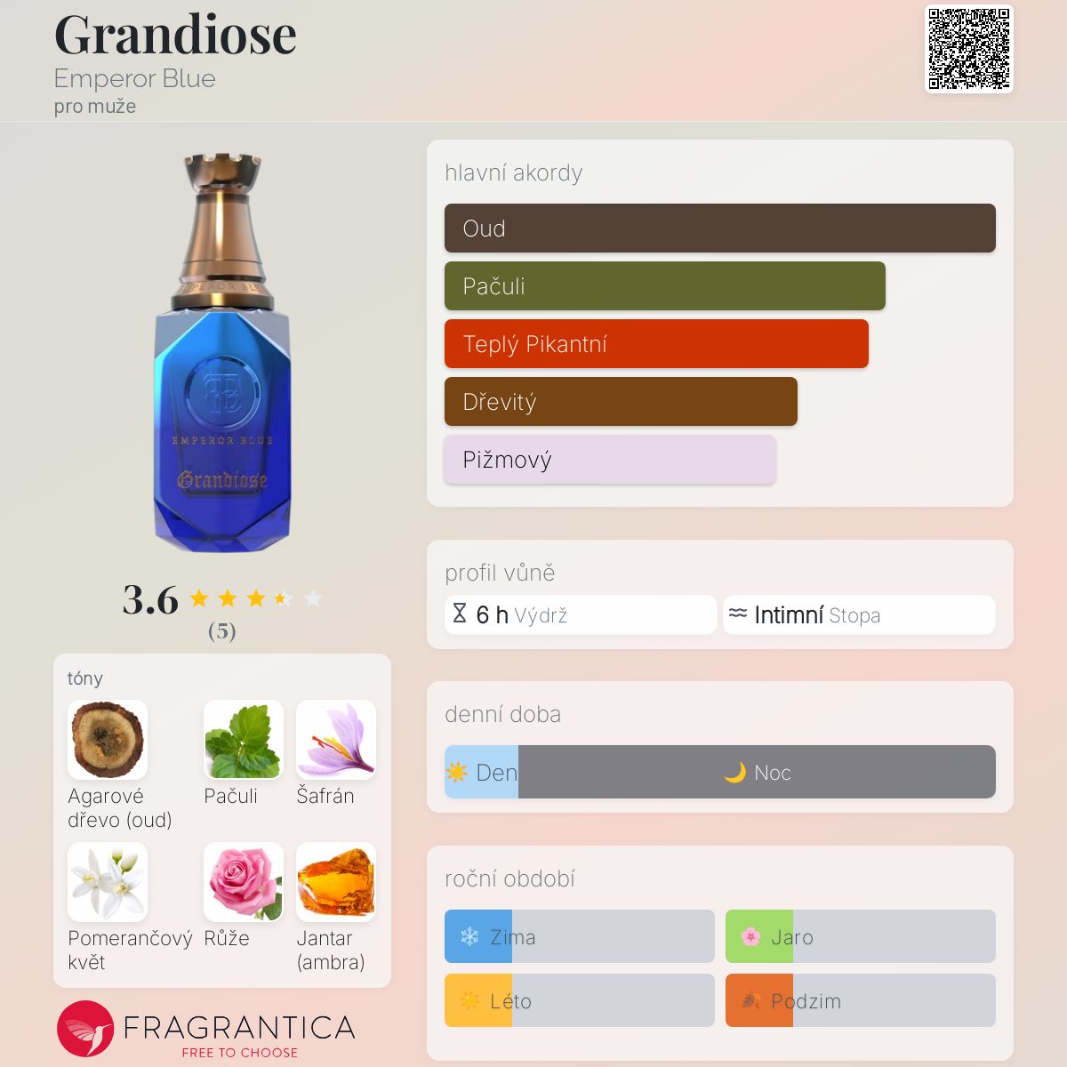 Grandiose podle Emperor Blue je vůně pro muže. Toto je nová vůně. Grandiose byl/a uveden/a v roce 2024. Vrchní tóny jsou Šafrán a Pomerančový květ; střední tóny jsouRůže a Jantar (ambra) ; základní tóny jsou Agarové dřevo (oud), Pačuli a Pižmo.