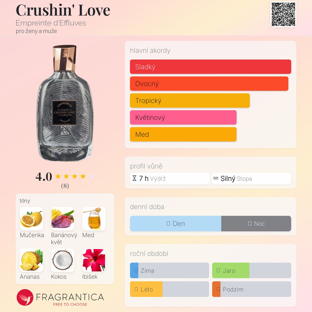 Crushin' Love podle Empreinte d'Effluves je Floral Fruity Gourmand vůně pro ženy a muže. Toto je nová vůně. Crushin' Love byl/a uveden/a v roce 2024. "Nosem" za touto vůní je Margaux Le Paih Guérin. Vrchní tóny jsou Mučenka, Ananas, Ibišek a Černý rybíz; střední tóny jsouBanánový květ, Med, Kokosové mléko, Datle a Jasmín ; základní tóny jsou Vanilka, Mléko, Fazole tonka, Pižmo, Dubový mech a Virginský cedr.