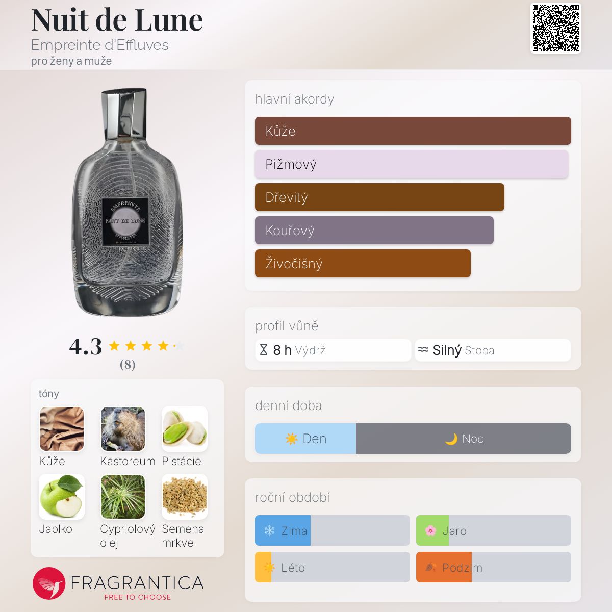 Nuit de Lune podle Empreinte d'Effluves je Orientální vůně pro ženy a muže. Toto je nová vůně. Nuit de Lune byl/a uveden/a v roce 2024. "Nosem" za touto vůní je Nathalie Feisthauer. Vrchní tóny jsou Pistácie, Zelené jablko, Mandle, Hořká mandle a Bergamot; střední tóny jsouSemena mrkve, Guatemalský kardamom a Šafrán ; základní tóny jsou Kůže, Kastoreum, Cypriolový olej, Vietnamský oud, Ambroxan, Ambrette (přírodní pižmo), Pižmo, Amyris, Jantar (ambra), Kašmírové dřevo, Virginský cedr, Atlasový cedr, Dubový mech, List indonéského pačuli, Dřevité tóny a Madagaskarská vanilka.