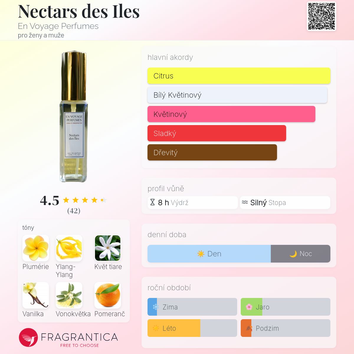 Nectars des Iles podle En Voyage Perfumes je Floral Fruity vůně pro ženy a muže. "Nosem" za touto vůní je Juan Perez. Vrchní tóny jsou Vonokvětka, Pomeranč, Mandarinka a Limetka; střední tóny jsouPlumérie, Ylang-Ylang, Květ tiare, Gardénie a Jasmín ; základní tóny jsou Vanilka, Santalové dřevo, Jantar (ambra) a Pižmo.
