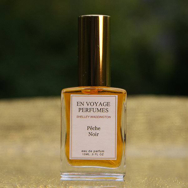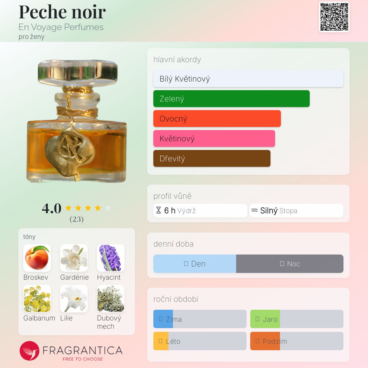 Peche noir podle En Voyage Perfumes je Chypre Fruity vůně pro ženy. "Nosem" za touto vůní je Shelley Waddington. Vrchní tóny jsou Broskev, Gardénie, Hyacint, Galbanum a Bergamot; střední tóny jsouLilie, Konvalinka, Jasmín, Růže a Orris ; základní tóny jsou Dubový mech, Jantar (ambra), Kůže, Vetiver, Santalové dřevo a Pižmo.