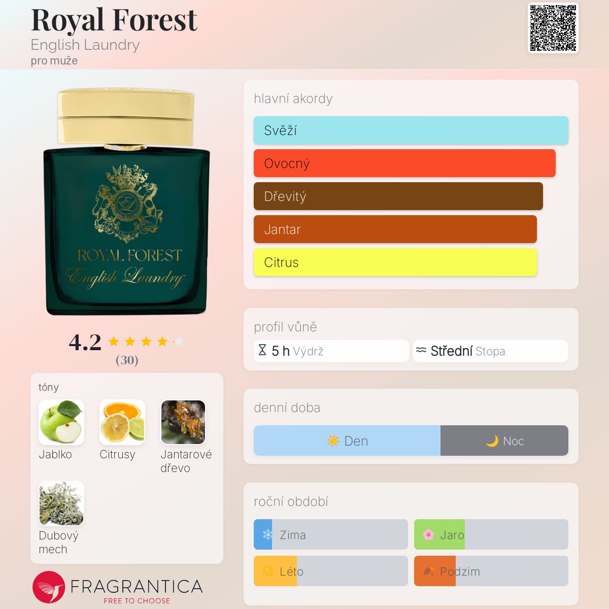 Royal Forest podle English Laundry je Woody Aromatic vůně pro muže. Vrchní tón je Citrusy ; střední tón jeJablko ; základní tóny jsou Jantarové dřevo a Dubový mech.