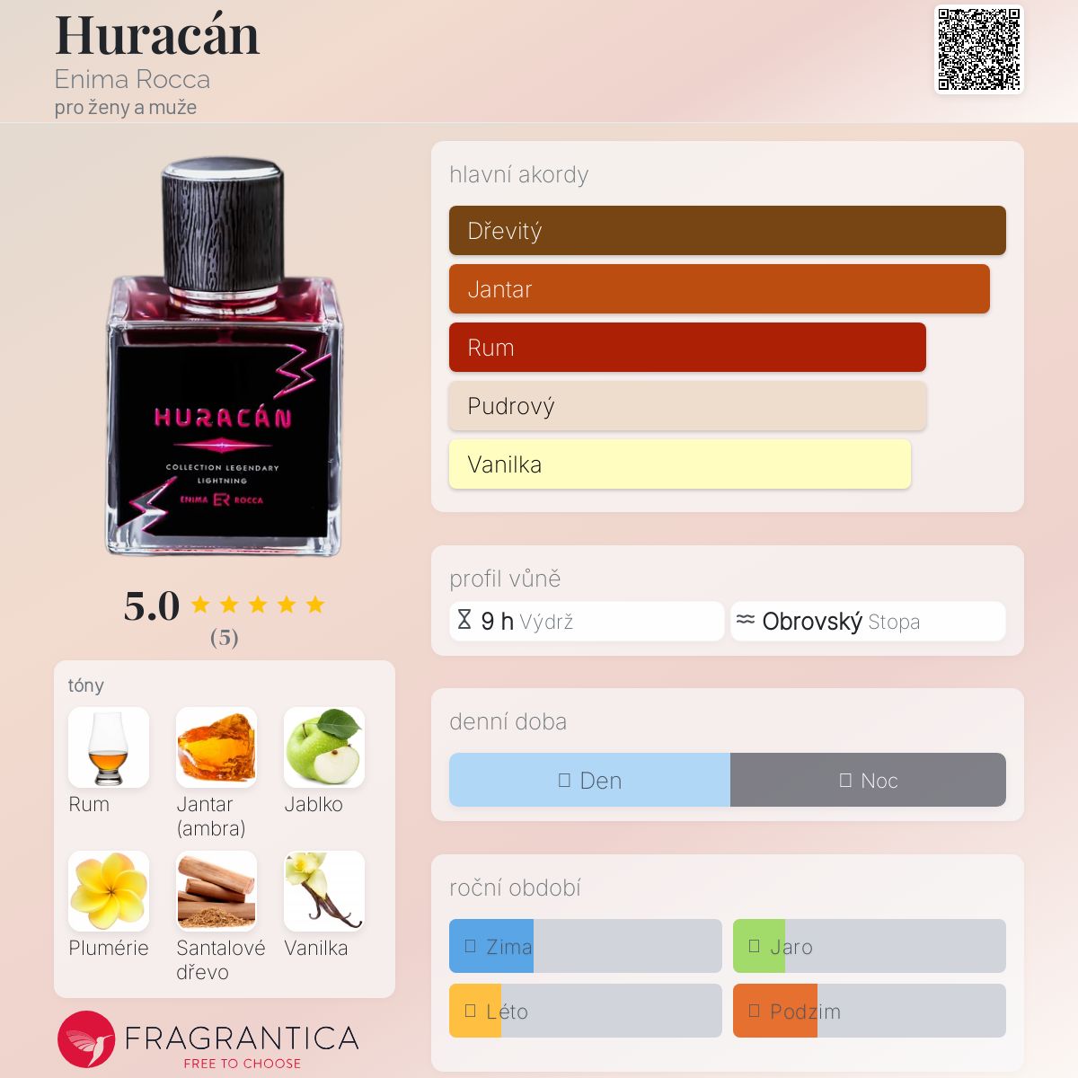 Huracán podle Enima Rocca je Orientální Vanilla vůně pro ženy a muže. Toto je nová vůně. Huracán byl/a uveden/a v roce 2025. "Nosem" za touto vůní je Touficq Redouane. Vrchní tóny jsou Rum a Jablko; střední tóny jsouPlumérie, Karamel a Mandle ; základní tóny jsou Jantar (ambra), Santalové dřevo, Vanilka, Cukrová vata a Pačuli.