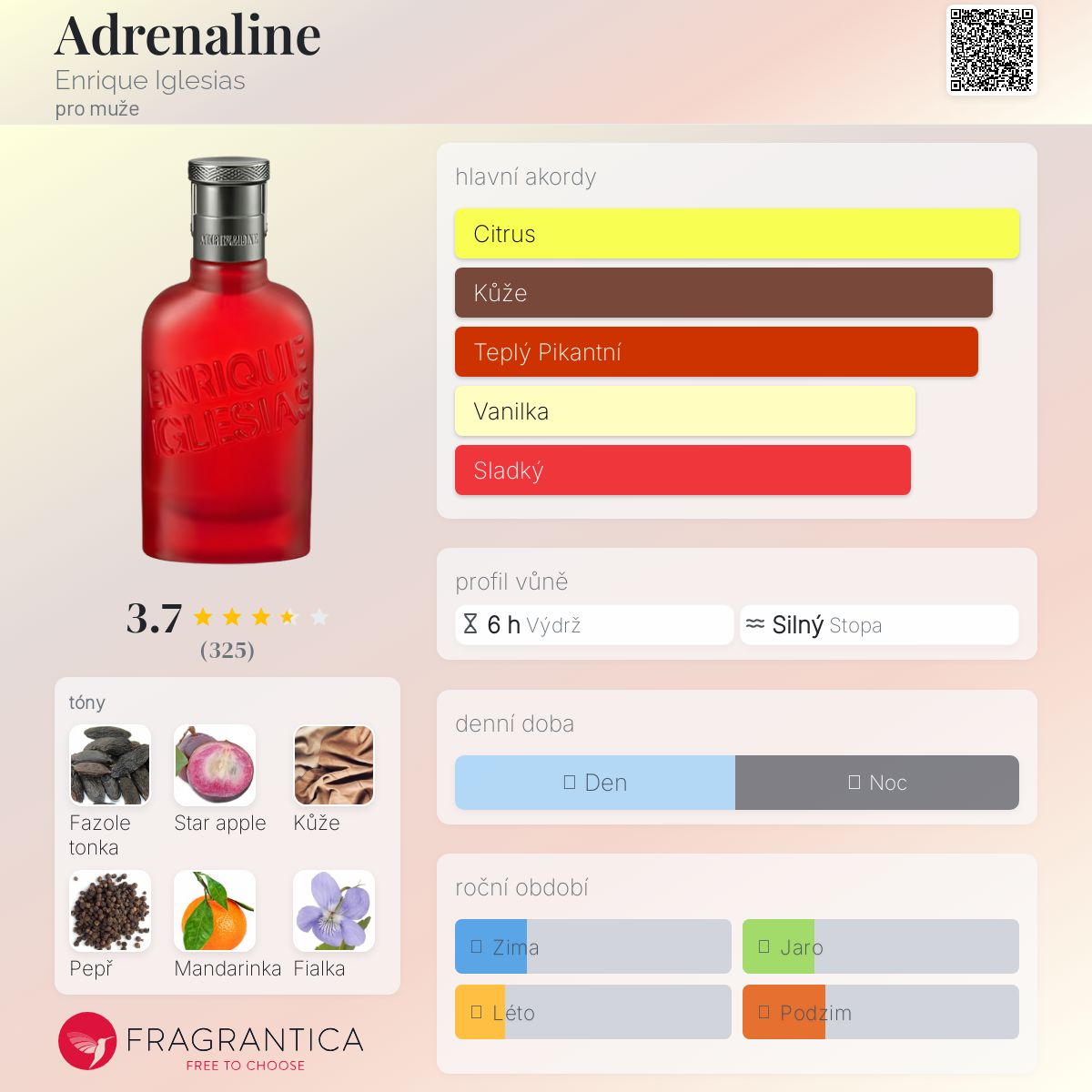 Adrenaline podle Enrique Iglesias je Woody Spicy vůně pro muže. Adrenaline byl/a uveden/a v roce 2014. "Nosem" za touto vůní je Guillaume Flavigny. Vrchní tóny jsou Mandarinka, Fialka a Citrón; střední tóny jsouStar apple, Černý pepř a Šafrán ; základní tóny jsou Fazole tonka, Kůže a Cedr.